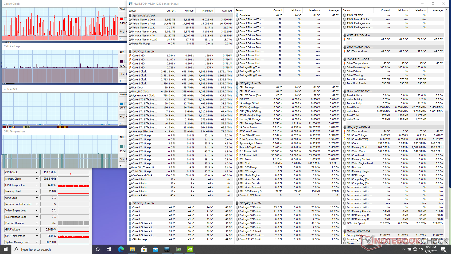 Beim Ausführen von Prime95, um die CPU zu belasten, steigen die Taktraten für etwa 30 bis 40 Sekunden auf 3,3 GHz bis 3,4 GHz bei einer Kerntemperatur von 93 °C. Danach sinken die Taktraten und wechseln zwischen 2,1 und 3 GHz bei angenehmen 69 °C bis 87 °C. Dieses Zyklusverhalten ist ungewöhnlich, lässt sich aber auch bei der Dell-XPS-Serie beobachten.