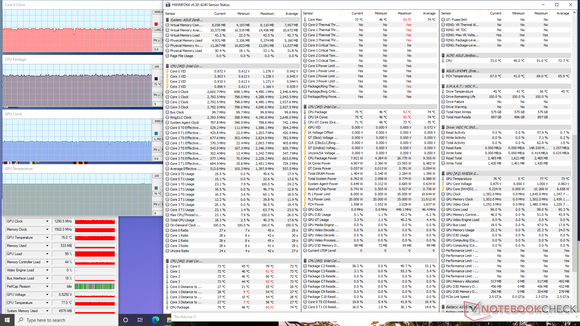 Bei der Ausführung von Witcher 3, um realistischere Stressbedingungen darzustellen, stabilisierten sich CPU und GPU bei 75 °C bzw. 76 °C, im Vergleich zu nur 58 °C bzw. 59 °C beim schnelleren Razer Blade Stealth.