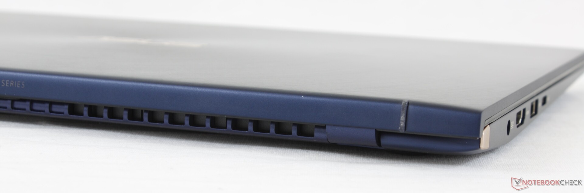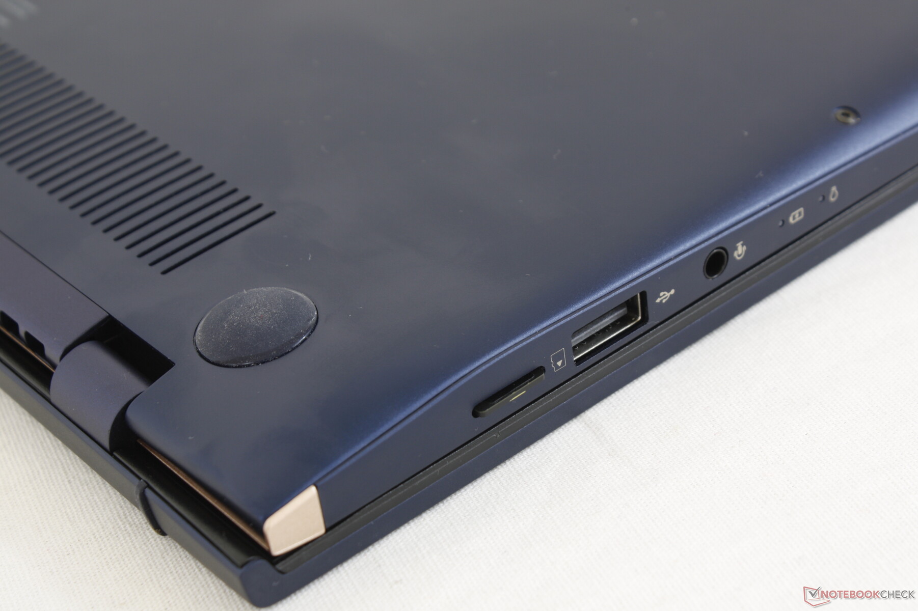 Das UX434 besitzt die gleichen Anschlüsse wie das UX433. Beachten Sie, dass der USB-C-Port weder Thunderbolt 3 noch DisplayPort unterstützt. Die Portpositionierung entlang der linken Seite ist außerdem recht eng, sodass dickere Stecker den Zugang zu benachbarten Anschlüssen blockieren könnten.