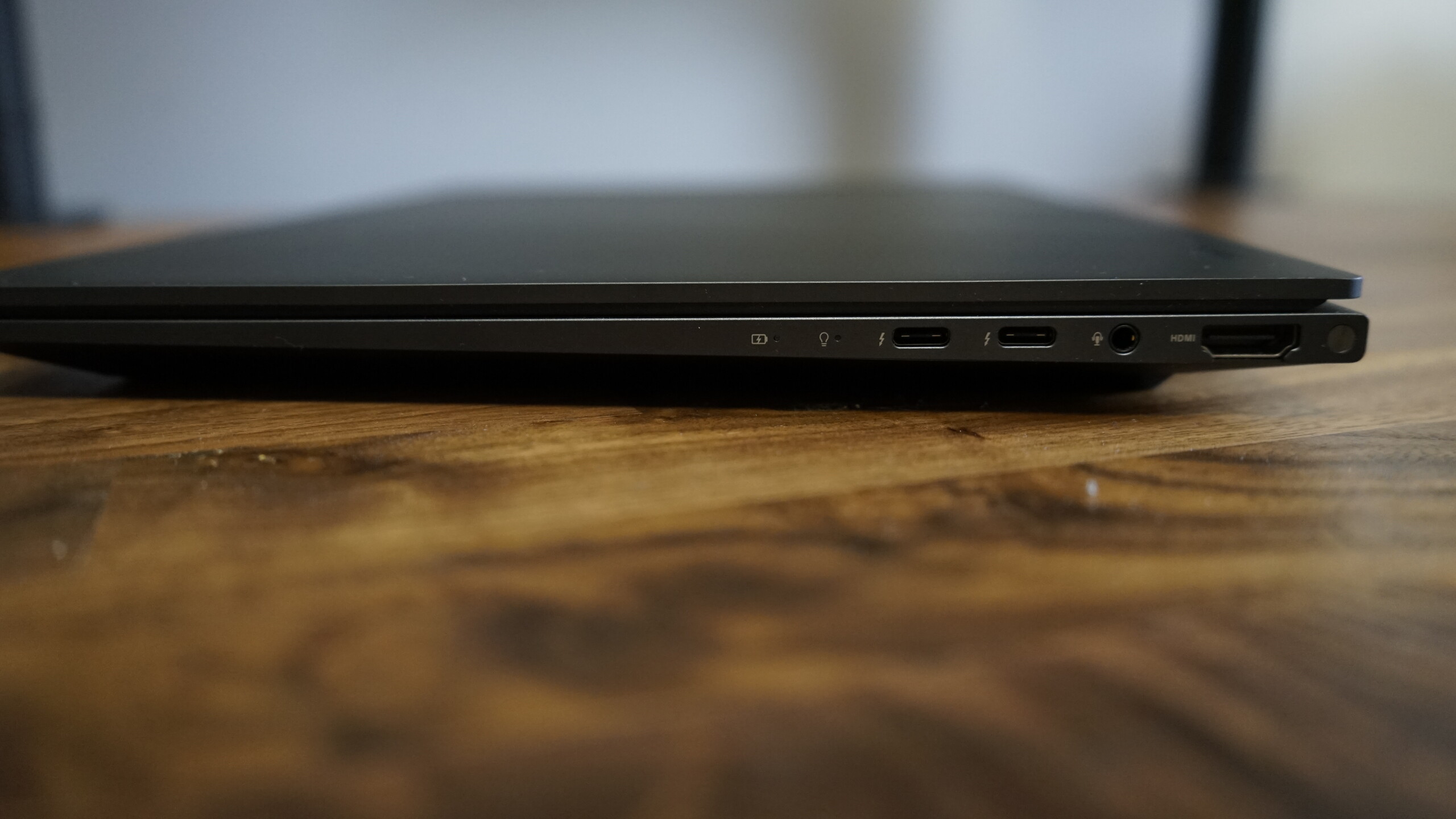 Bei den Anschlüssen muss im Vergleich zur Vorgängerversion nun bedauernswerterweise auf den microSD-Reader verzichtet werden. Auch die Position der anderen Anschlüsse hat sich geändert. Auf der linken Seite findet sich nun nur noch ein USB 3.2 Gen 2 Typ-A Anschluss. Alle anderen Anschlüsse, also zweimal Thunderbolt, einmal HDMI 2.1 und der Audio-Combo-Port sind nun auf der rechten Seite angesiedelt. Beide Thunderbolt-Ports lassen sich zum Laden nutzen, sodass wir es präferiert hätten, wenn auf beiden Seiten jeweils einer der Anschlüsse verfügbar gewesen wäre.