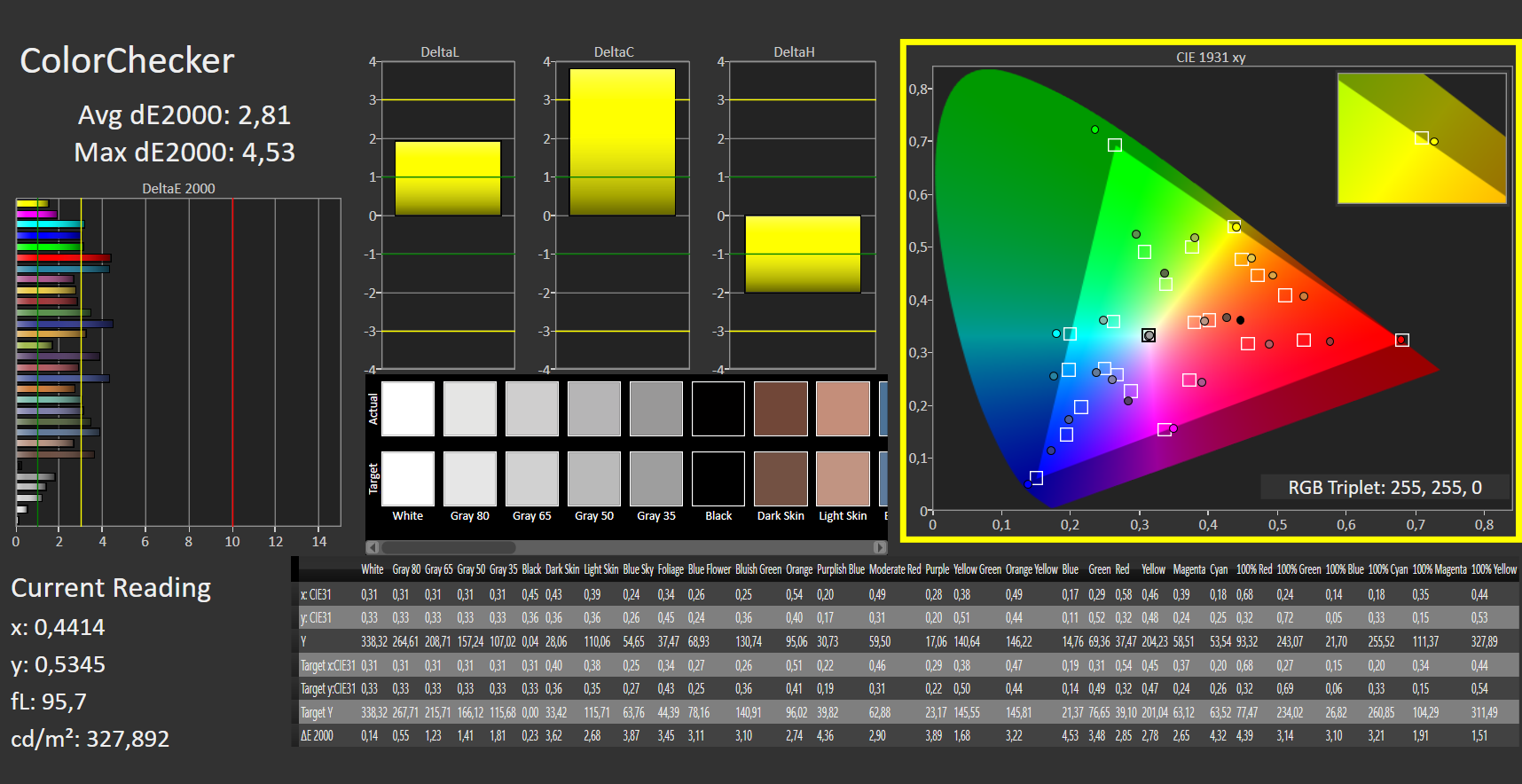 Dazu verspricht es 100 % DCI-P3 Color Gamut, was wir durch Messungen auch bestätigen können. Asus spricht von 400 Nits Helligkeit, wir messen 347 cd/m² im Durchschnitt und 351 im Maximum. Nits und cd/m² werden 1:1 umgerechnet, die vom Hersteller angekündigte Helligkeit haben wird also nicht messen können. Die Helligkeit ist homogen verteilt, das ist typisch für OLED.