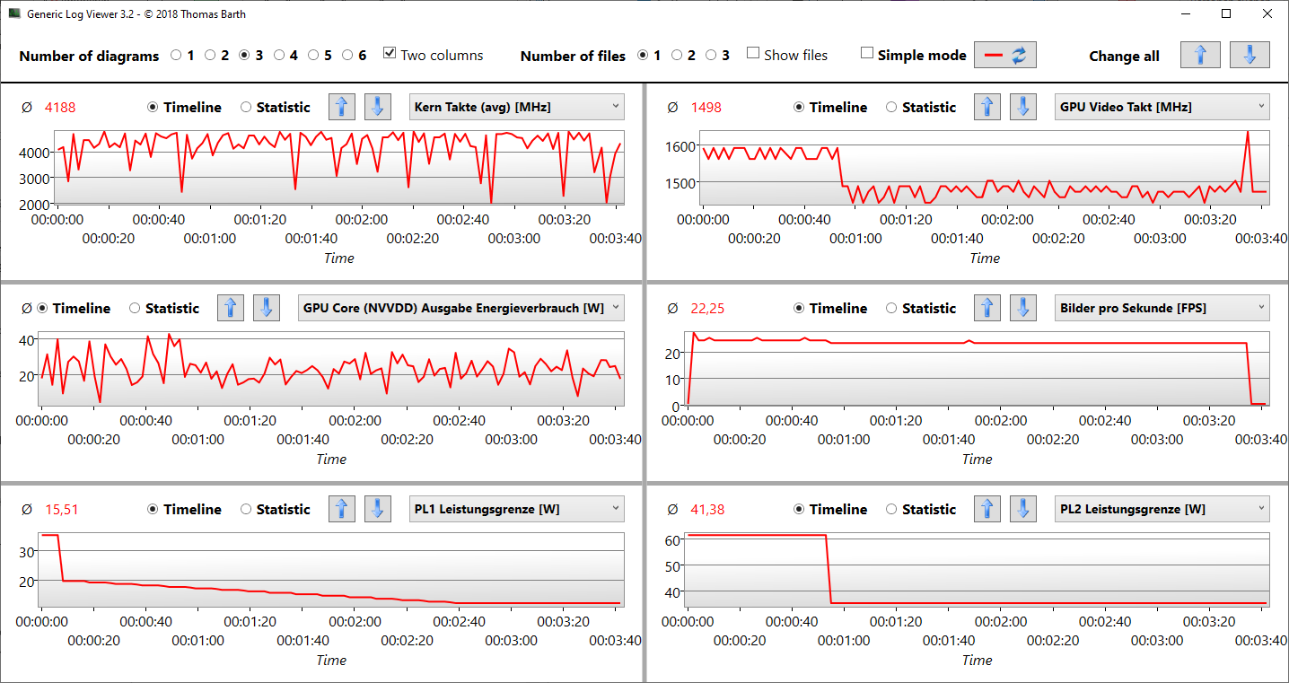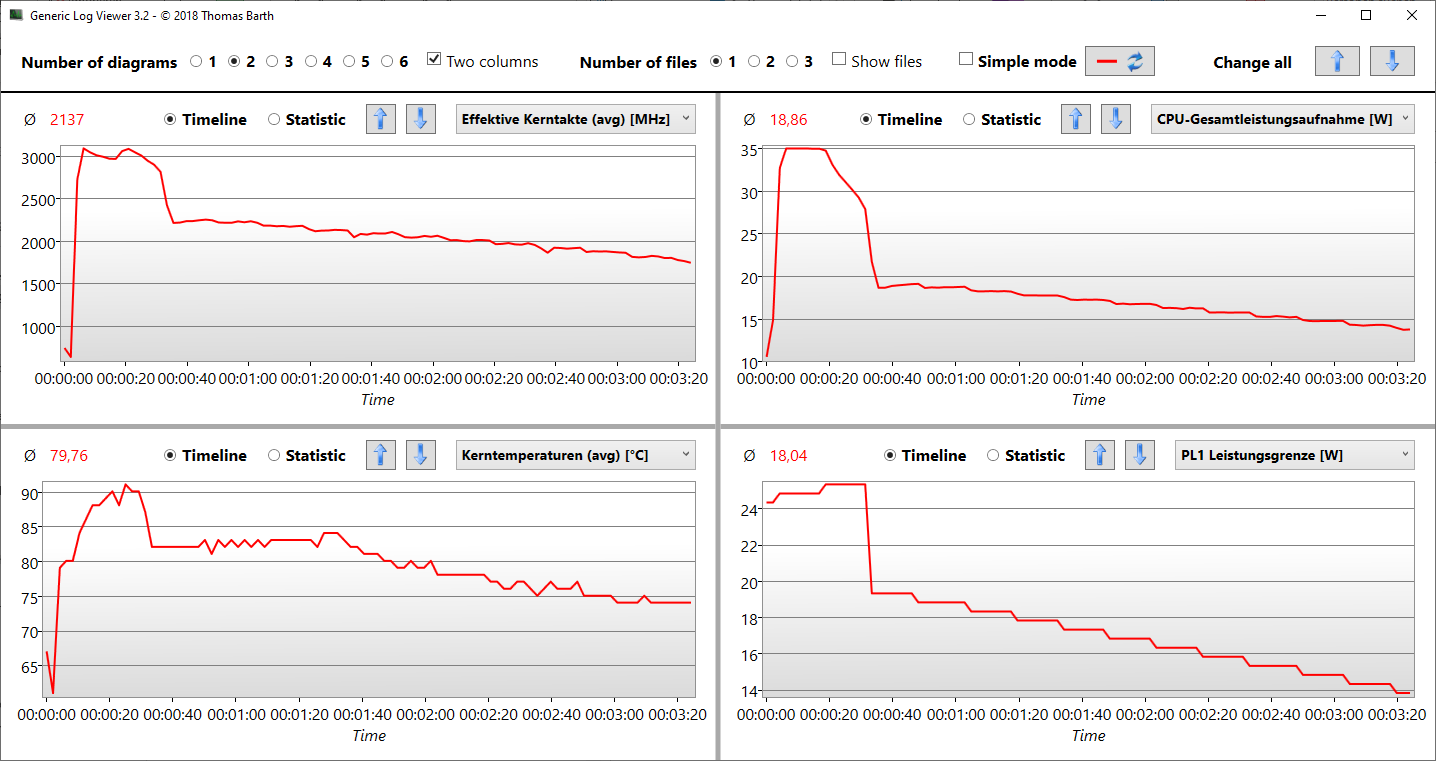 Etwas anders läuft die Sache unter Asus Ausgeglichen: Hier sind es zum Start 3,0 GHz, nach 20 Sekunden 2,2 GHz mit absteigender Tendenz. Die PL1-Leistungsgrenze sinkt im gleichen Zuge von 25 auf 18 Watt mit absteigenden Werten. Statt 40 Watt darf sich der Prozessor nur noch 18 Watt gönnen. Kurz: Wer Rechenleistung braucht, der darf den Asus Leistungsmodus nicht vergessen.