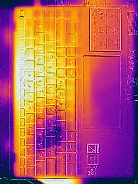 Im Office-Szenario hatten wir ein jederzeit höchstens handwarmes Gerät auf dem Tisch, also im Hotspot 35 bis 40 Grad. Der Luftauslass befindet sich an der linken Seite, der Einzug zwischen den Gelenken. Bei Last steigt die Abwärme am Gehäuse deutlich, punktuell bis auf 50 Grad oben wie unten. Die Handballenauflage überschreitet 37 Grad nicht, auf der Tastatur können es aber durchaus 49 Grad werden.