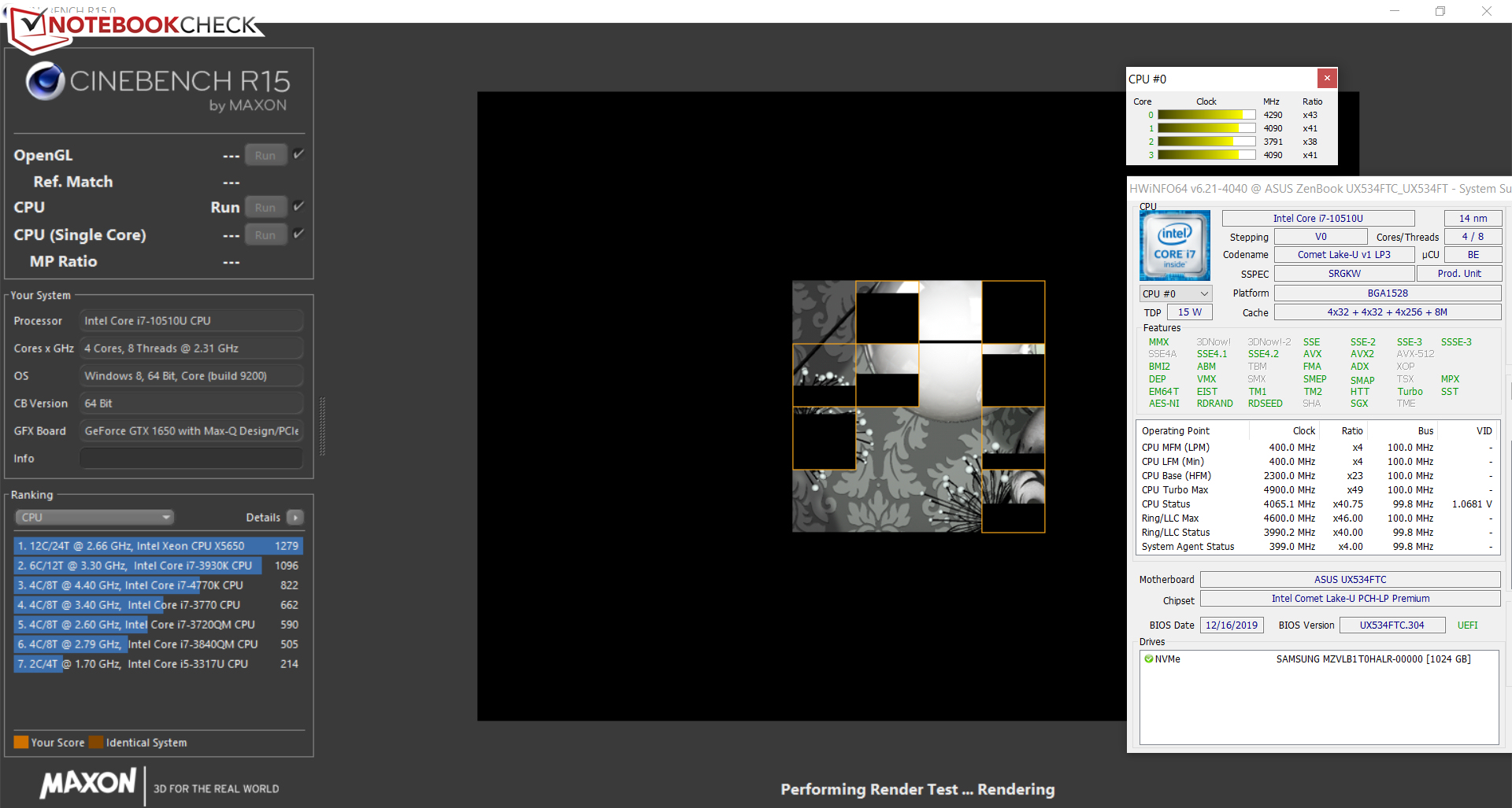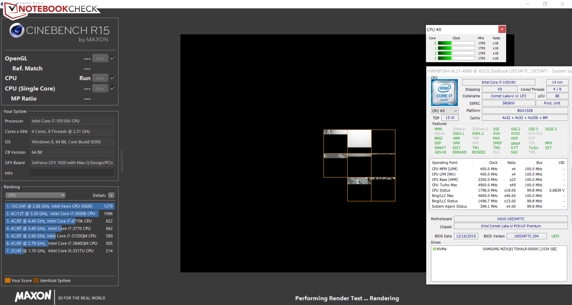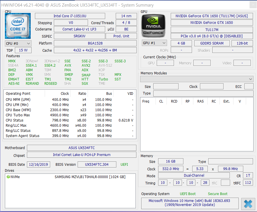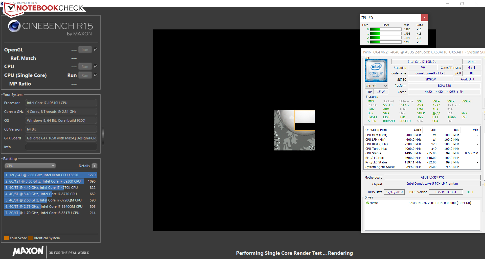 Das Zenbook hat einen Intel Core-i7-10510U-Vierkernprozessor an Bord. Hierbei handelt es sich um ein ULV-Modell, das auf Intels Comet-Lake-Architektur basiert. Der Prozessor arbeitet mit einer Basisgeschwindigkeit von 1,8 GHz. Mittels Turbo ist eine Steigerung auf 4,3 GHz (alle vier Kerne), 4,8 GHz (zwei Kerne) bzw. 4,9 GHz (ein Kern) möglich.