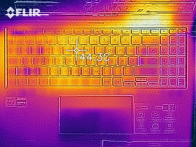 Sonderlich stark erwärmt sich das Notebook nicht. Während des Stresstests registrieren wir an drei Messpunkten Temperaturen knapp oberhalb von 40 Grad Celsius. Während der Durchführung des Witcher-3-Tests (das Spiel läuft 1 Stunde in Full-HD-Auflösung und maximalen Qualitätseinstellungen) fällt die Erwärmung geringer aus. Im Alltagsbetrieb liegen die Werte im grünen Bereich.