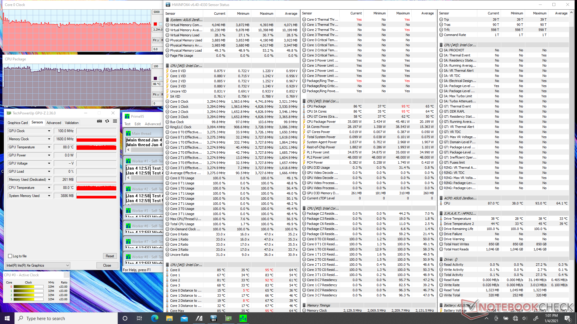 Die Ausführung von Prime95 lässt die CPU für wenige Sekunden auf 4,1 GHz hochschnellen und das bei einer Kerntemperatur von 95 °C. Danach fallen die Taktraten und die Temperatur und stabilisieren sich auf nachhaltigere Werte von 3,3 GHz bzw. 87 °C. Das ZenBook 14 UX425EA, das exakt die gleiche Core i7-1165G7-CPU wie unser UX482EA verwendet, pendelt sich unter ähnlichen Bedingungen bei viel niedrigeren Taktraten und Temperaturen von 2,4 GHz bzw. 68 °C ein. Signifikante Temperaturunterschiede können zwischen den beiden Laptops auch im Witcher-3-Betrieb beobachtet werden. Das UX482 wird definitiv warm, aber die Nutzer erhalten mehr Leistung aus der gleichen internen Hardware.