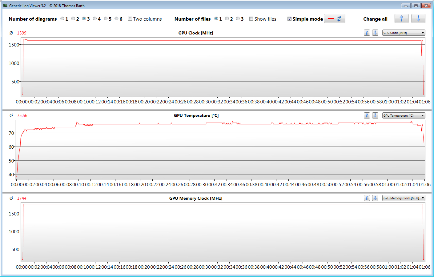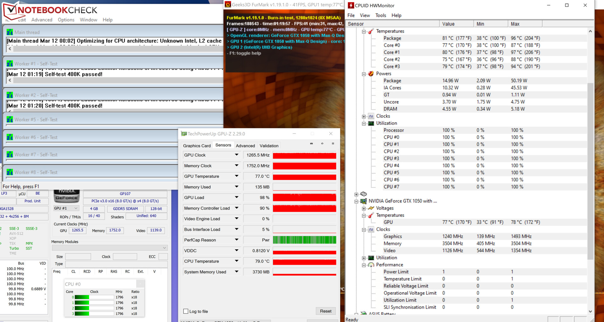 Unseren Stresstest (Prime95 und FurMark laufen für mindestens eine Stunde) bearbeitet der Prozessor im Netzbetrieb nur anfänglich mit Geschwindigkeiten jenseits von 3 GHz. Schon innerhalb der ersten Minute sinkt der Takt auf 1,7 bis 1,8 GHz und verbleibt auf diesem Niveau. Der Grafikkern geht mit 1,2 bis 1,3 GHz zu Werke. Im Akkubetrieb liegen die Taktraten bei 1,8 bis 2,6 GHz (CPU) bzw. 1.000 MHz (GPU). Der Stresstest stellt ein Extremszenario dar, welches so im Alltag nicht auftritt. Wir überprüfen mit diesem Test, ob das System auch bei voller Auslastung stabil läuft.