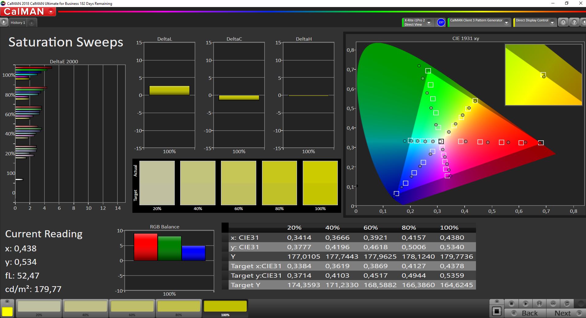 Die Kalibrierung ab Werk ist nicht schlecht und es gibt auch keinen Farbstich, doch einige Farben weichen vom Zielwert (<3) ab, was wir auch mit unserer Kalibrierung (CalMAN + X-Rite i1 Pro 2) nicht vollständig korrigieren können. Daher ist das Panel nicht perfekt für die Bearbeitung von Bildern oder Videos, obwohl der P3-Farbraum vollständig abgedeckt wird. Wir hätten uns zudem ein weiteres Profil gewünscht, mit dem man auch im sRGB-Farbraum arbeiten kann. Hier haben mobile Workstations mit dem 4K-Panels in der Regel einen Vorteil.