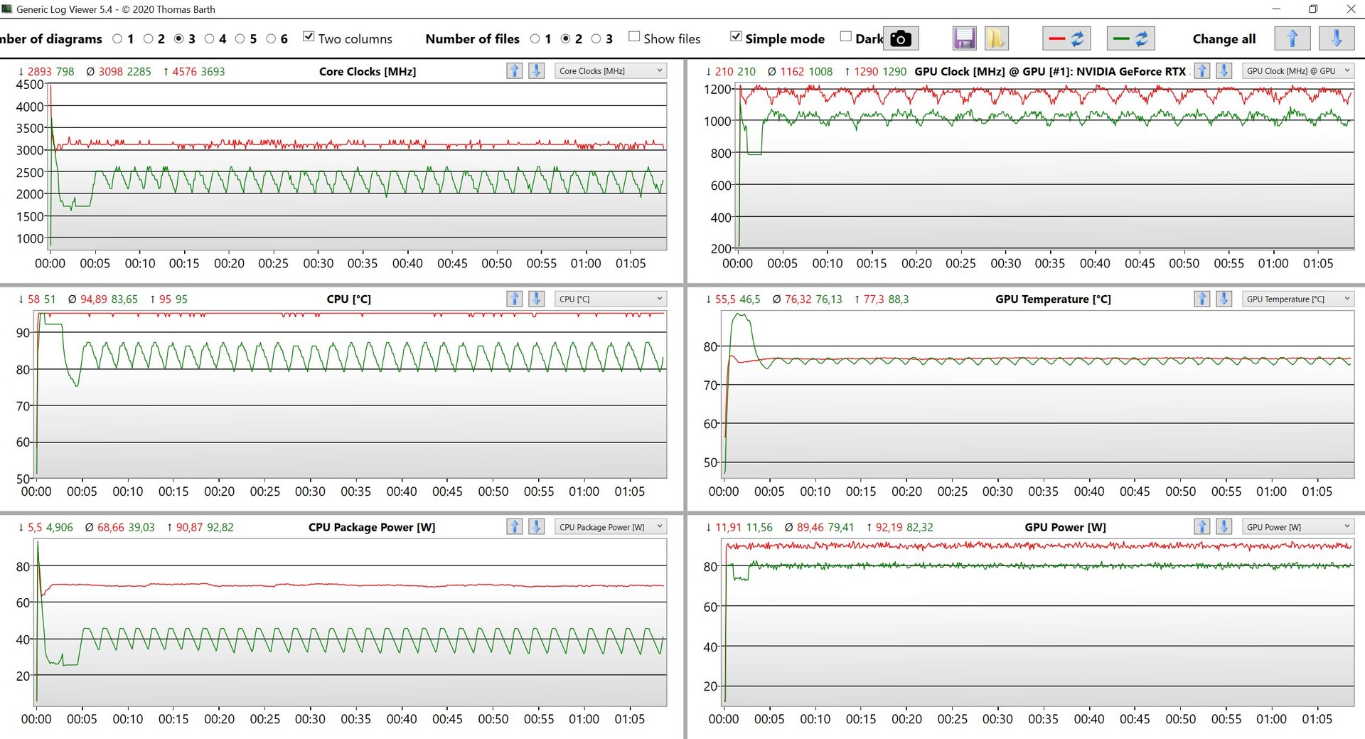 Im Stresstest mit kombinierter CPU- und GPU-Last ist die Leistung immer noch sehr gut, vor allem im Leistungsmodus. Die CPU arbeitet mit stabil mit knapp 70 Watt und die GPU noch mit 90 Watt. Im normalen Modus wird vor allem die Prozessorleistung reduziert (~40 Watt), die Grafikkarte bleibt aber bei 80 Watt. Das sind hervorragende Ergebnisse.