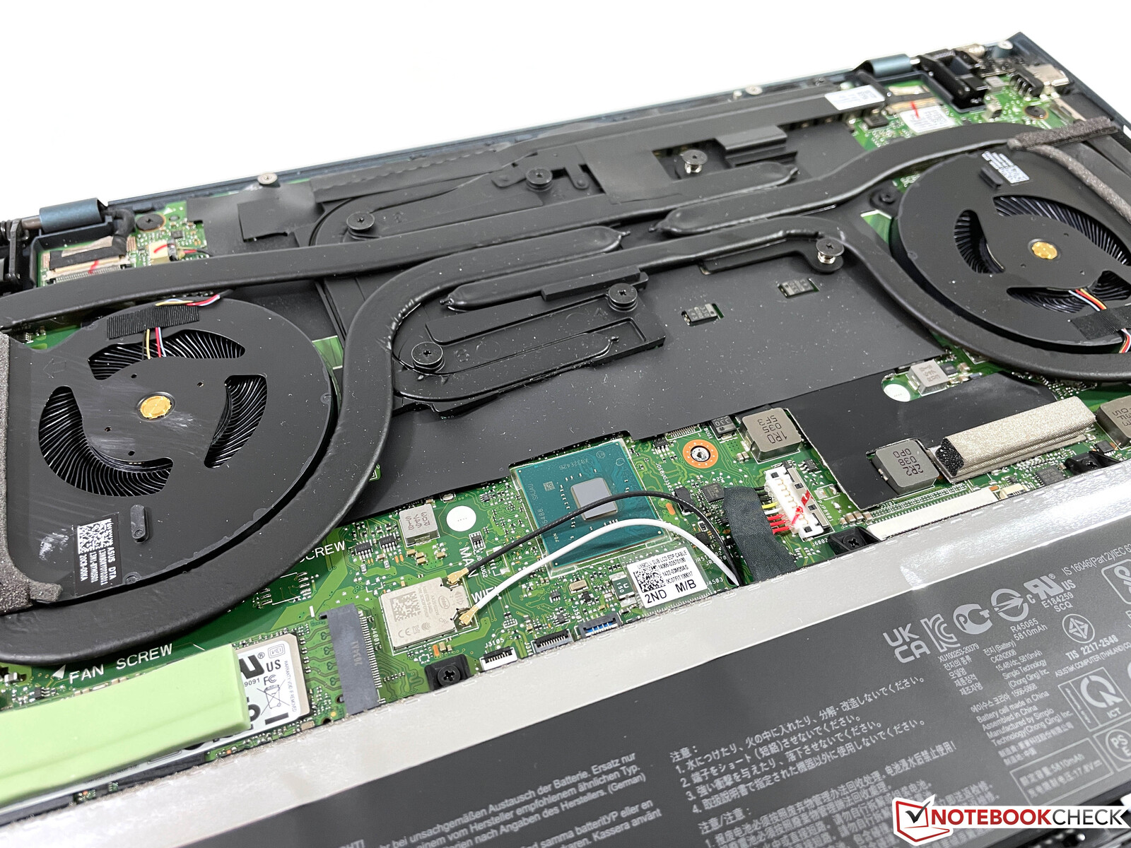 Die untere Abdeckung ist mit mehreren Kreuzschrauben gesichert, die mittleren drei sind allerdings noch mit einem kleinen Klebepad verdeckt. Viel lässt sich im Inneren allerdings nicht erledigen, denn fast alle Komponenten (inklusive dem RAM) sind verlötet und man kann lediglich die Lüfter reinigen und die M.2-SSD tauschen.