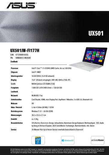 Nun ist das UX501 laut Asus als Modellvariante ZenBook Pro UX501JW-FI177H ohne Touchscreen-Funktionalität zu einer UVP von knapp 1600 Euro deutschlandweit verfügbar. Wie wir bei einer Kurzrecherche herausgefunden haben, ist im Handel zudem die Ausstattungsvariante UX501JW-FI218H zu einem vergleichbaren Preis gelistet. Die SKU FI218H hat allerdings nicht das schnelle High-Speed-WLAN 802.11 ac des FI177H an Bord, sondern begnügt sich stattdessen mit WLAN 802.11 a/g/n.