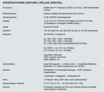 Das Asus ZenFone 2 Deluxe (ZE551ML) Smartphone hat aber nicht nur optisch einiges zu bieten. Auch die Ausstattung des Premium-Smartphones stimmt. Angetrieben wird das Asus-Phone von einem Intel Atom Z3580 4-Kern-Prozessor der Moorefield Plattform. Als Memory sind neben satten 4 GB RAM auch gleich 128 GB interner Speicher an Bord, der sich optional zudem noch mit microSD-Karten (bis 128 GB) erweitern lässt.