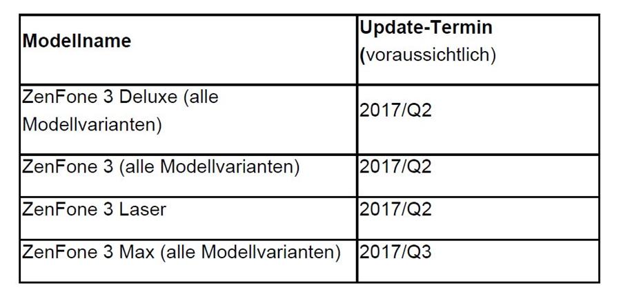 Demnach bekommen alle Modellvarianten des 5,7-Zoll-Smartphones ZenFone 3 Deluxe, alle Ausführungen des ZenFone 3 mit 5,2 Zoll (ZE520KL) und 5,5 Zoll (ZE552KL), das ZenFone 3 Laser (5,5 Zoll) sowie alle Varianten des ZenFone 3 Max als ZC553KL (5,5") und ZC520TL (5,2") das Update auf Android 7.x Nougat.