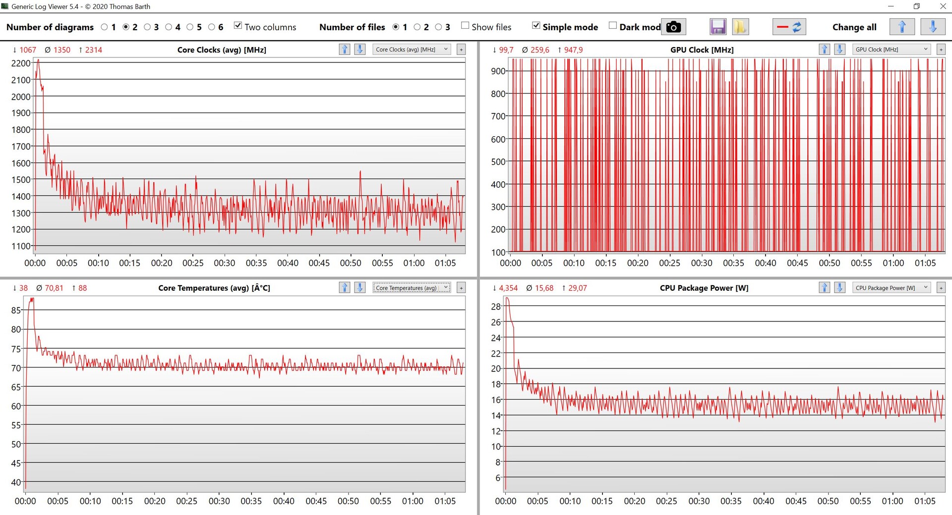 Im Stresstest gibt es starke Fluktuationen des GPU-Taktes, die CPU-Leistung bleibt aber stabil. Direkt im Anschluss an den Stresstest gab es keine Leistungsreduzierung.