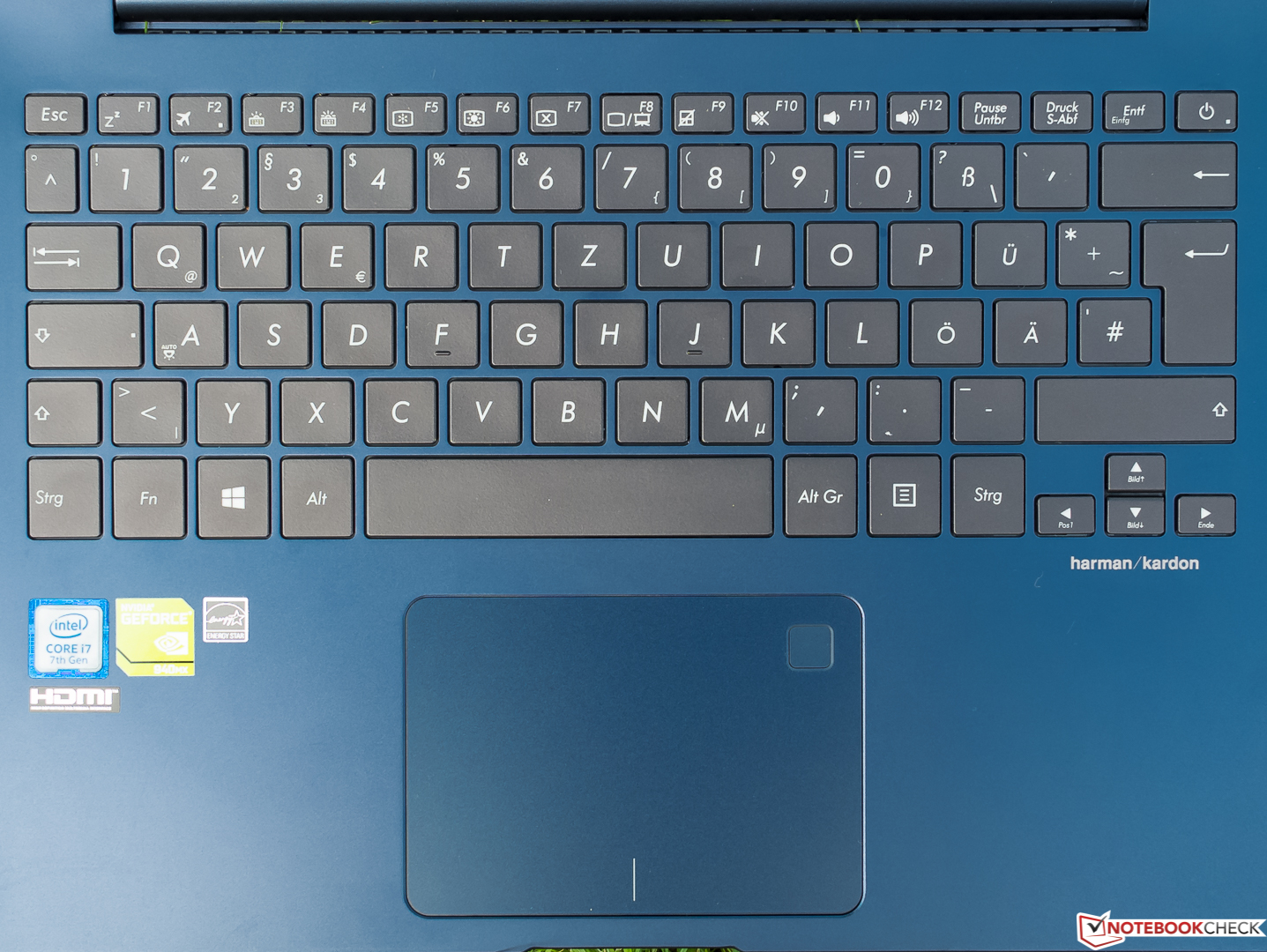 Asus spendiert dem Zenbook UX3430 eine Chiclet-Tastatur im Desktop-Format, was für ausreichend große Tasten und Abstände sorgt. Die Keys sind flach, weisen einen Hubweg von vielleicht 1,5 mm auf und verfügen über einen gut spürbaren, aber nicht unbedingt knackigen Druckpunkt. In Sachen Anschlag muss zwischen kleineren und größeren Keys unterschieden werden. Letztgenannte klappern bei Betätigung vernehmlich und haben einen harten Anschlag, der der kleineren, fast lautlosen Tasten ist hingegen für den Geschmack des Testers zu weich und vermittelt ein etwas schwammiges Schreibgefühl.