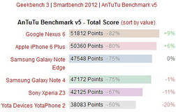 Der Atom Z3580 integriert zudem eine flotte PowerVR G6430 GPU von Imagination Technologies, die beispielsweise auch im Apple A7 Chip und damit im iPhone 5s zum Einsatz kommt. Vergleichen wir den aufgetauchten Score mit den AnTuTu-Einträgen in unserer eigenen Datenbank, dann rangiert das Zenfone 2 in der Spitzenliga von Samsung Galaxy Note 4 (Total Score: 47172 Punkte), Apple iPhone 6 Plus (50360) und Google Nexus 6 mit 51812 Punkten.
