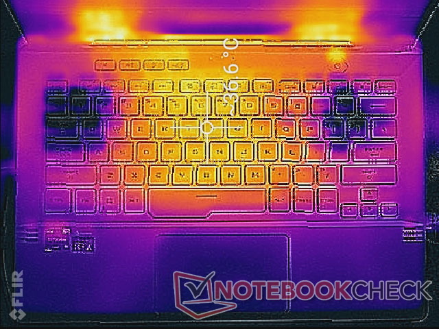 Die Oberflächentemperatur ist selbst im Leerlauf ohne aktive Anwendungen relativ warm - das ist für einen Zephyrus Laptop allerdings normal. In der Mitte der Tastatur und der Unterseite kann das Gerät bis zu 30 °C erreichen, während das Asus Zephyrus M GU502GU unter den gleichen Umständen noch wärmer wird. Beim Gamen können Nutzer Hotspots von 40 bis 47 °C erwarten. Das größere Razer Blade 15 erreicht ähnliche Werte. Die Handballenablage wird beim Gamen auch etwas wärmer, ist allerdings nie unangenehm heiß.