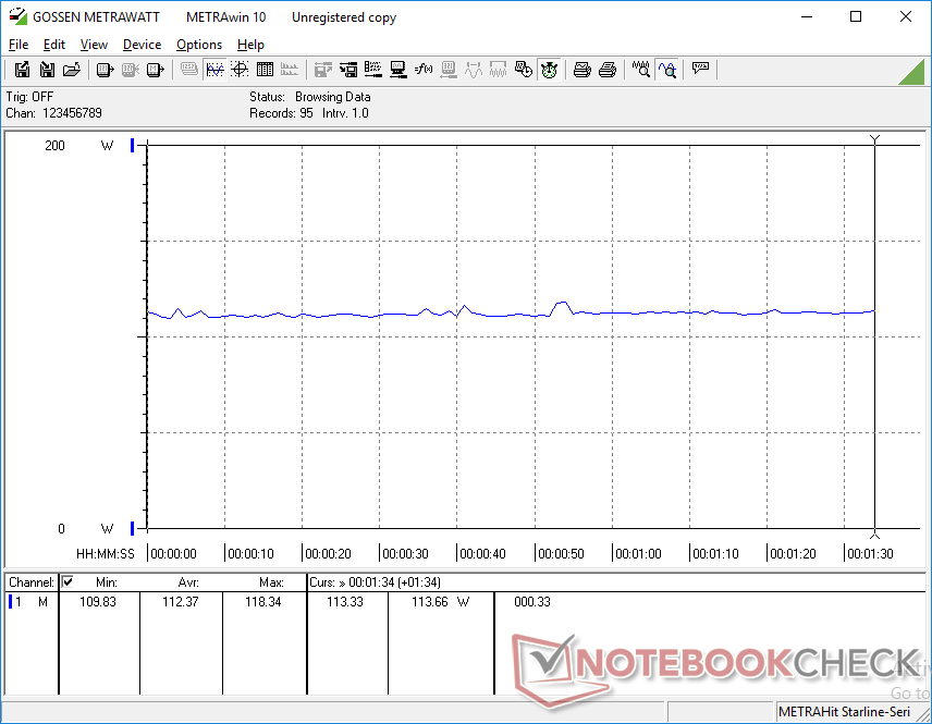 Das Gerät zog maximal 156,6 W aus dem mittelgroßen 180-W-Netzgerät (15 x 7,2 x 2,3 cm), während Prime95 und FurMark gleichzeitig liefen. Allerdings ist die Energieaufnahme nur kurzfristig so hoch (siehe unten). Die Energieaufnahme unter Prime95 ist nicht konstant, was die Ergebnisse der CineBench Schleife sowie die unterschiedlichen Taktraten bestätigt.