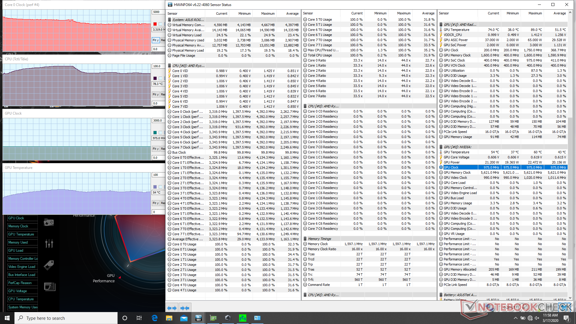 Die Energieaufnahme normalisiert sich unter höherer Belastung. Beim Gamen nimmt das Gerät zwischen 92 und 112 W auf, während das mit dem langsameren Intel Core i7-9750H und der GTX 1660 Ti ausgestattete Zephyrus M hier zwischen 111 und 149 W konsumiert. Das entspricht einer Einsparung von 25 Prozent, während die Grafikleistung um 5 bis 10 Prozent besser ist und die Multi-Thread-CPU-Leistung sogar ganze 80 Prozent schneller ist. Die Vorteile der durchschnittlichen Leistung pro Watt des Zephyrus G14 sind beeindruckend.