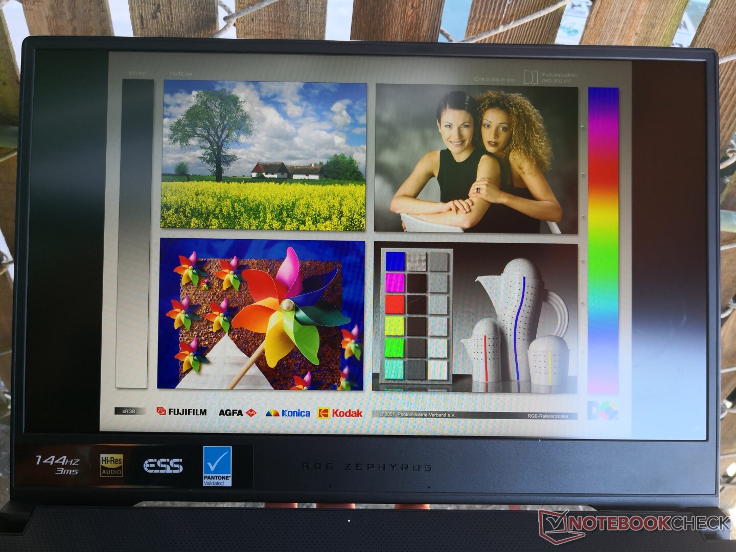 Die Lesbarkeit des Displays im Freien sowie die Blickwinkel sind mit denen des Zephyrus S GX502GW vergleichbar, da Asus für die beiden Modelle das gleiche Panel einsetzt. Wir empfehlen Nutzern, wenn möglich im Schatten zu arbeiten, da Farben bei direkter Sonneneinstrahlung stark ausgewaschen werden.