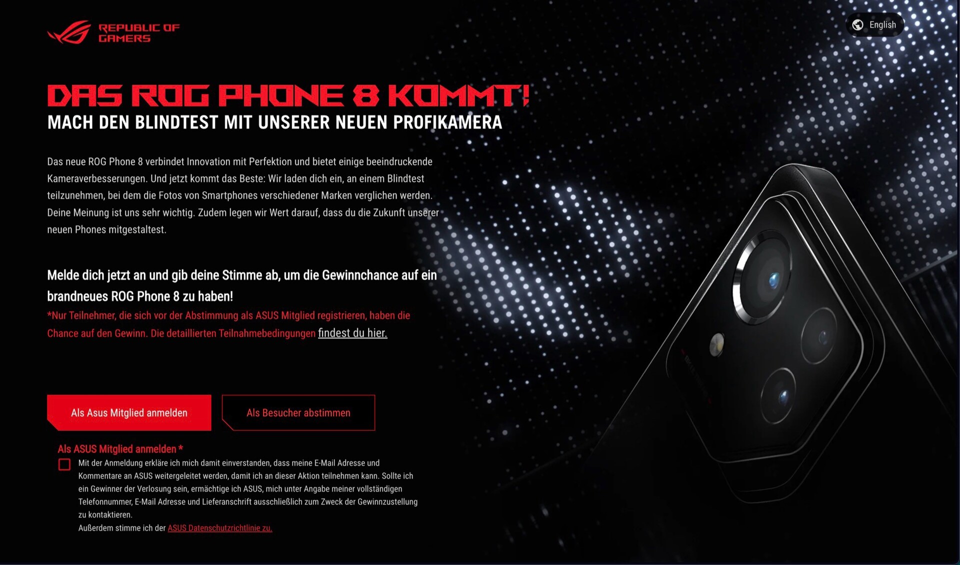 In einem der Teaser verspricht Asus ein brandneues Kamerasystem, das bereits durch einen Kamera-Blindtest demonstriert wird, bei dem jeweils ein Foto des ROG Phone 8 zwei Fotos anderer Smartphones gegenübergestellt wird. Die Resultate dieses Blindtests sollen Asus beim Optimieren der Kameras helfen, Teilnehmer erfahren nicht, welches Bild mit welchem Smartphone aufgenommen wurde, für die Mühe erhalten registrierte Asus-Kunden allerdings immerhin die Chance, ein ROG Phone 8 zu gewinnen.