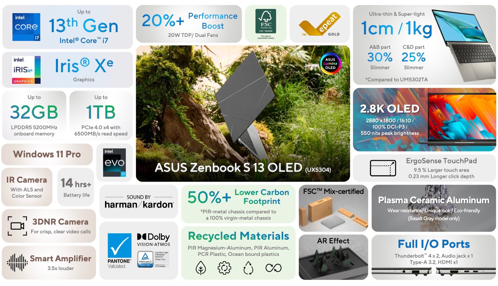 Laut Asus handelt es sich beim neuen Zenbook S 13 OLED um das dünnste 13,3 Zoll Ultrabook der Welt. Dennoch soll das UX5304 keine Kompromisse machen, denn Asus ersetzt den AMD Ryzen 7 6800U durch einen nicht näher genannten Intel Core i7 der 13. Generation mit einer TDP von 20 Watt, der eine 20 Prozent bessere Performance liefern soll. Damit müssen Nutzer zwar auf AMDs schnelle Radeon 680M iGPU verzichten, die Akkulaufzeit soll aber nicht unter dem Intel-Chip leiden, denn Asus verspricht eine Laufzeit von 14 Stunden.