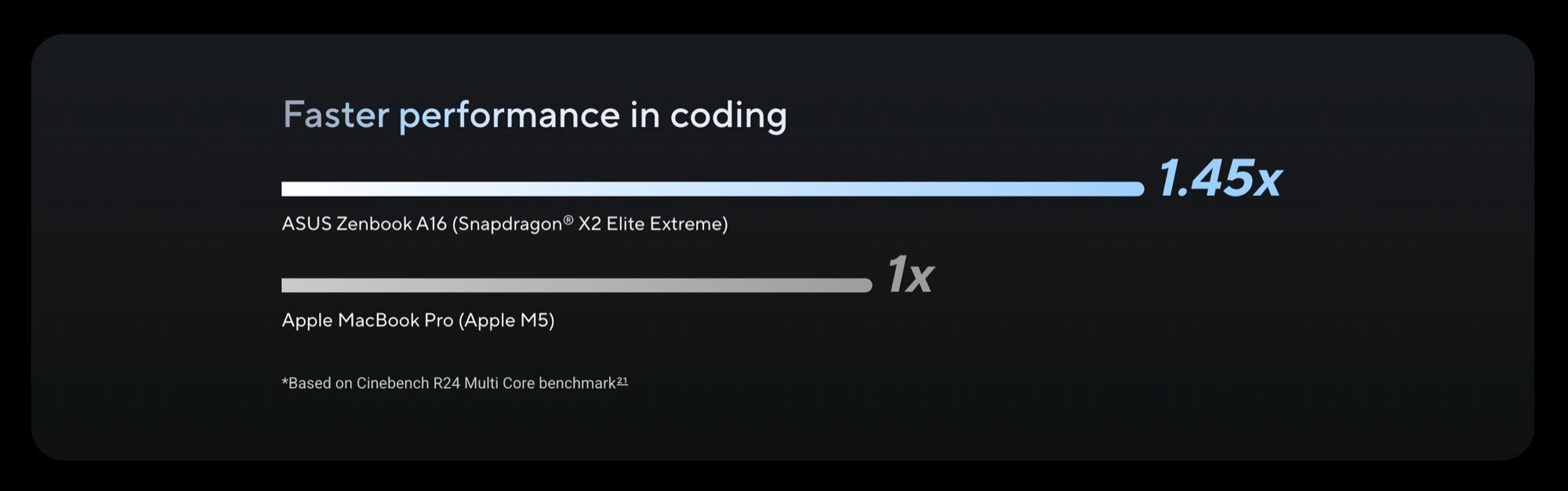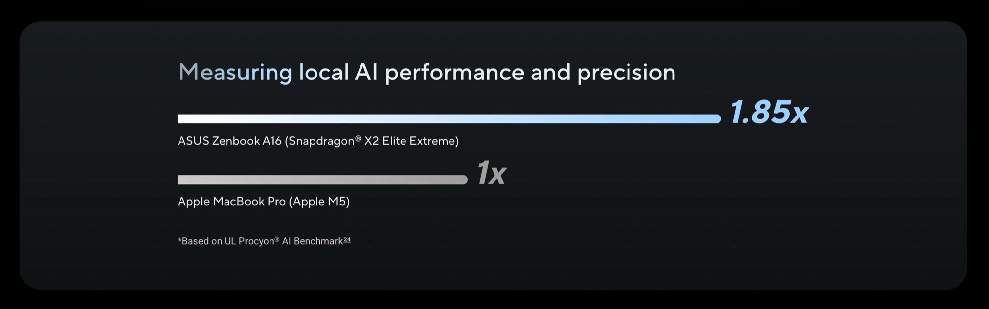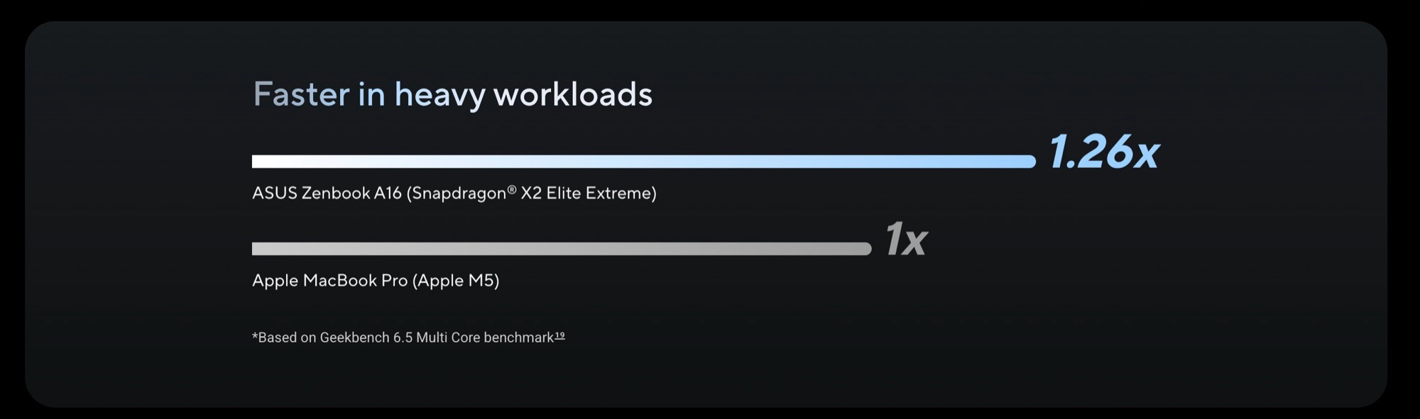 Diese soll durch den Qualcomm Snapdragon X2 Elite Extreme ermöglicht werden, der im Vergleich zum Apple M5 wesentlich größer ausfällt, denn der Chip besitzt 18 statt nur zehn CPU-Kerne, und verbraucht 80 Watt statt nur 30 Watt Strom. Damit spielt der Chip mindestens in der Klasse des Apple M5 Pro, der mit Preisen ab 2.499 Euro allerdings auch teurer ist, weshalb Asus den Vergleich zum sparsameren Apple M5 wohl für angemessen hält.