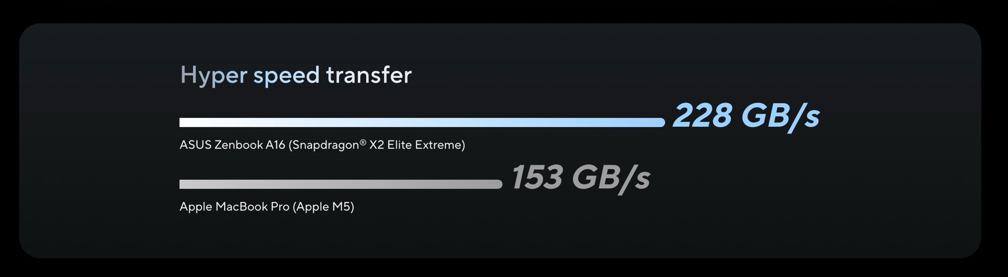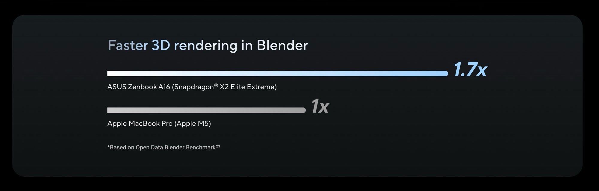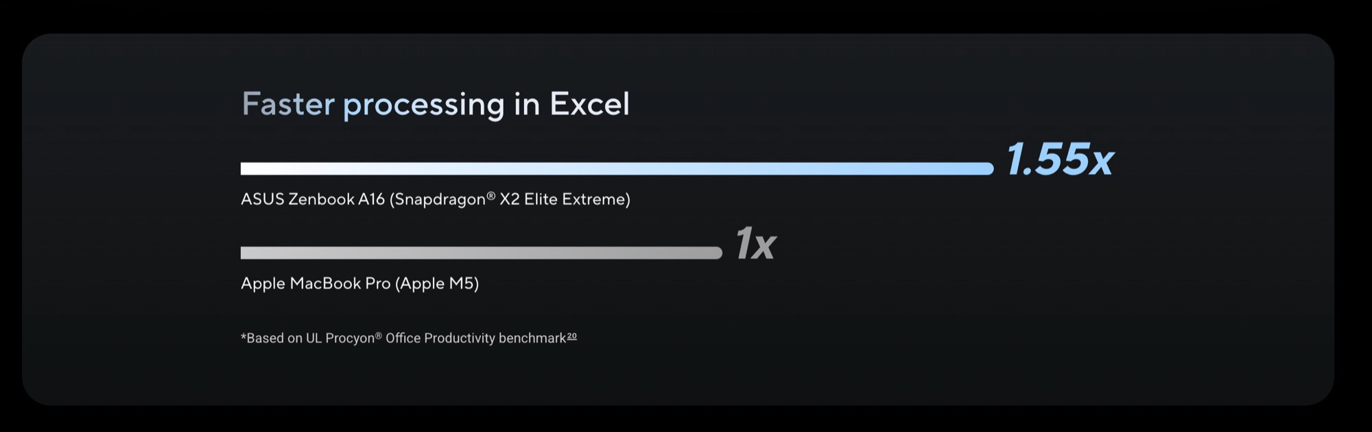 Diese soll durch den Qualcomm Snapdragon X2 Elite Extreme ermöglicht werden, der im Vergleich zum Apple M5 wesentlich größer ausfällt, denn der Chip besitzt 18 statt nur zehn CPU-Kerne, und verbraucht 80 Watt statt nur 30 Watt Strom. Damit spielt der Chip mindestens in der Klasse des Apple M5 Pro, der mit Preisen ab 2.499 Euro allerdings auch teurer ist, weshalb Asus den Vergleich zum sparsameren Apple M5 wohl für angemessen hält.