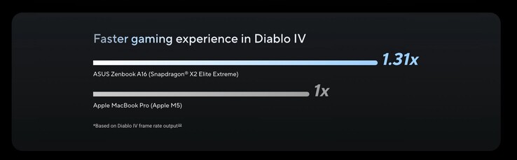 Asus bewirbt eine 26 Prozent höhere Multi-Thread-Performance in Geekbench 6.5, laut unserer Benchmarks ist der Snapdragon X2 Elite Extreme sogar bis zu 37,5 Prozent schneller. Der Apple M5 Pro würde den Snapdragon-Chip dagegen um 21 Prozent übertreffen. Bei Diablo IV soll das Zenbook A16 immerhin 31 Prozent höhere Bildraten erreichen als das MacBook Pro – nachdem Gaming eine der größten Schwächen des älteren Qualcomm Snapdragon X Elite war, ist das vielversprechend, mangels unabhängiger Benchmarks lässt sich diese Angabe aber noch nicht überprüfen.