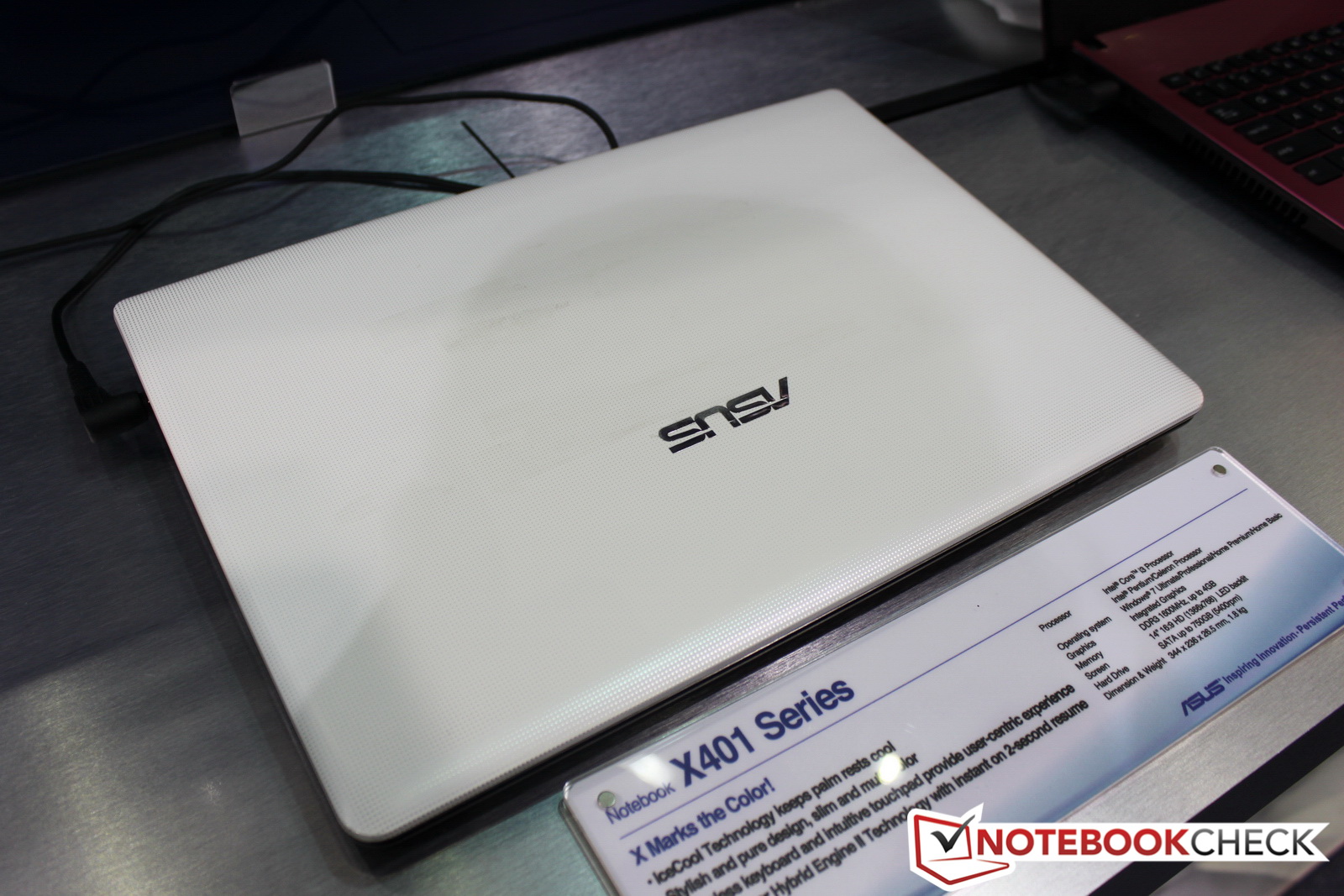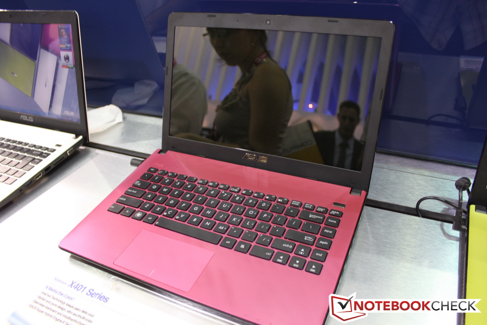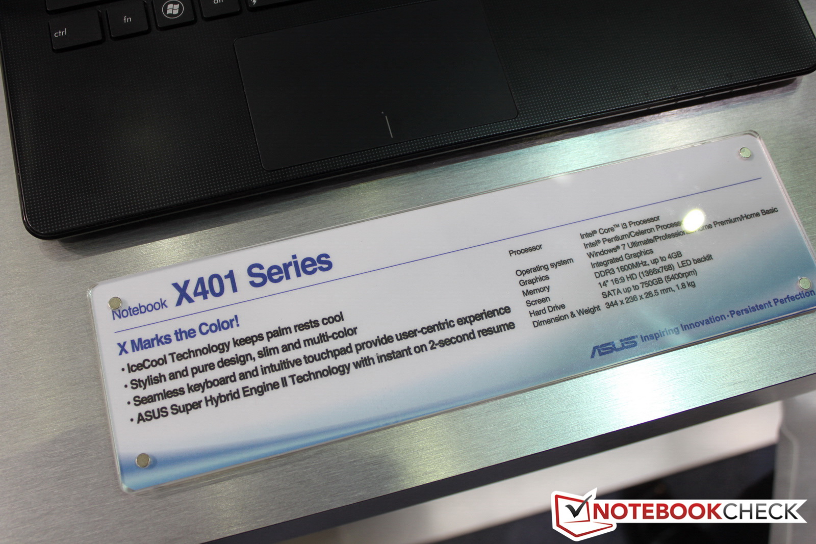 Die Tastatur des Asus X401 federt vergleichsweise sehr deutlich nach, an der Geräteunterseite finden sich keinerlei Wartungsklappen - sehr ungünstig, da so eine Reinigung, wie beispielsweise das regelmäßige Ausblasen des Gehäuselüfters unnötig erschwert wird. Gezeigt wurde die Serie Asus X401 in 4 Farben, wovon es zu uns nach Deutschland aber wohl lediglich Schwarz und Weiß schaffen werden.