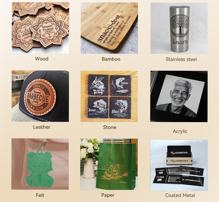 Es sollen sich über 200 verschiedene Materialien gravieren lassen, so beispielsweise Holz, Leder, Papier und lackiertes Metall. Optional ist auch noch eine Aufnahme für runde Gegenstände vorhanden, etwa eine Tasse lässt sich so bearbeiten. Mit dem AtomStack P1 lässt sich Herstellerangaben zufolge auch schneiden, allerdings in einem Durchgang nur 3 Millimeter tief - diese Angabe bezieht sich auf Lindensperrholz. Die Bearbeitungshöhe liegt bei 50 Millimetern. Angegeben wird eine Geschwindigkeit von bis zu 10.000 mm/min. Verschiedene Sicherheitsfeatures sind vorhanden, so gibt es etwa einen Türsensor und wenig überraschend eine Umhausung. Optional ist ein Luftfilter erhältlich, das System lässt sich mit einem USB-Stick sozusagen vor unbefugten Zugriff sperren. Nutzbar ist eine App und auch eine Software, wobei die Nutzung mit Windows, macOS, Android und iOS möglich sein soll.