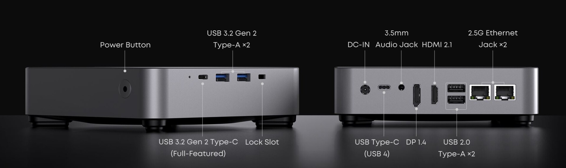 Vorhanden sind noch jeweils zweimal USB 3.2 Gen 2 im Typ A und USB 2.0, eine Klinkenbuchse für Lautsprecher oder Headsets und ein Rundstecker für die Versorgung mit elektrischer Energie. Zudem sind noch zweimal Ethernet mit 2,5 GBit/s verbaut, die Anbindung an ein Netzwerk kann auch über WiFi 6 erfolgen. Im Auslieferungszustand ist ein 16 Gigabyte großer DDR5-Arbeitsspeicher mit einer Taktfrequenz von 5.600 MHz vorhanden - da zwei Slots zugänglich sind, lässt sich der Arbeitsspeicher aber wechseln oder auf bis zu 64 Gigabyte aufrüsten. Belegt ist nur einer der beiden über PCIe 4.0 angeschlossenen M.2 2280-Slots - und zwar mit einer 512 Gigabyte großen SSD. Zumindest global ist der Mini-PC noch nicht verfügbar.