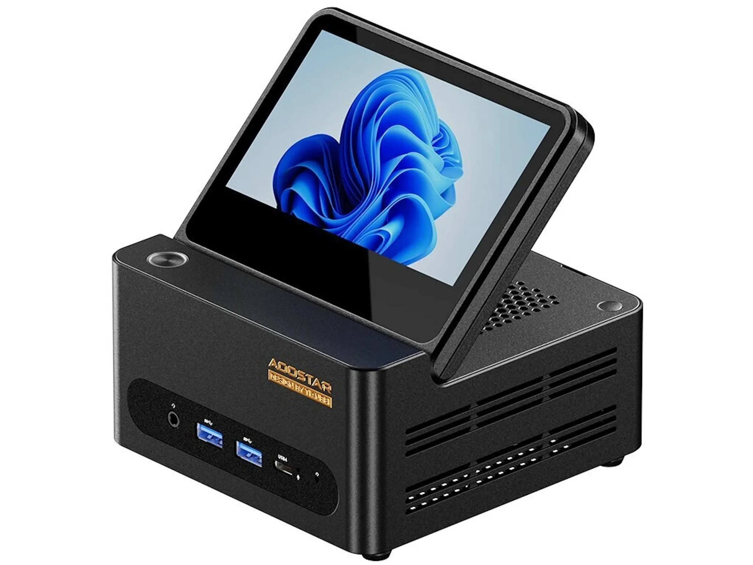 Der 130 x 130 x 67 Millimeter große Mini-PC kommt mit einem Display. Dieses ist klappbar, misst in der Diagonalen 5 Zoll und löst mit 1.920 x 1.080 Pixeln auf, im Prinzip lässt sich schon auf diesem Display das Betriebssystem darstellen, allerdings könnte sich dieses Display insbesondere als Zweitdisplay eignen. Die Ausgabe von Bildinhalten ist auch über HDMI möglich, allerdings stehen dafür auch USB 4 bereit - dieser universelle Anschluss kann ebenfalls zur Datenübertragung genutzt werden. USB im Typ A steht ebenfalls und jeweils zweimal an der Vorder- und der Rückseite bereit. Die drahtlose Netzwerkanbindung ist über WiFi 7 möglich, allerdings stehen auch zwei Ethernet-Ports mit einer maximalen Datenübertragungsrate von jeweils 2,5 GBit/s bereit.