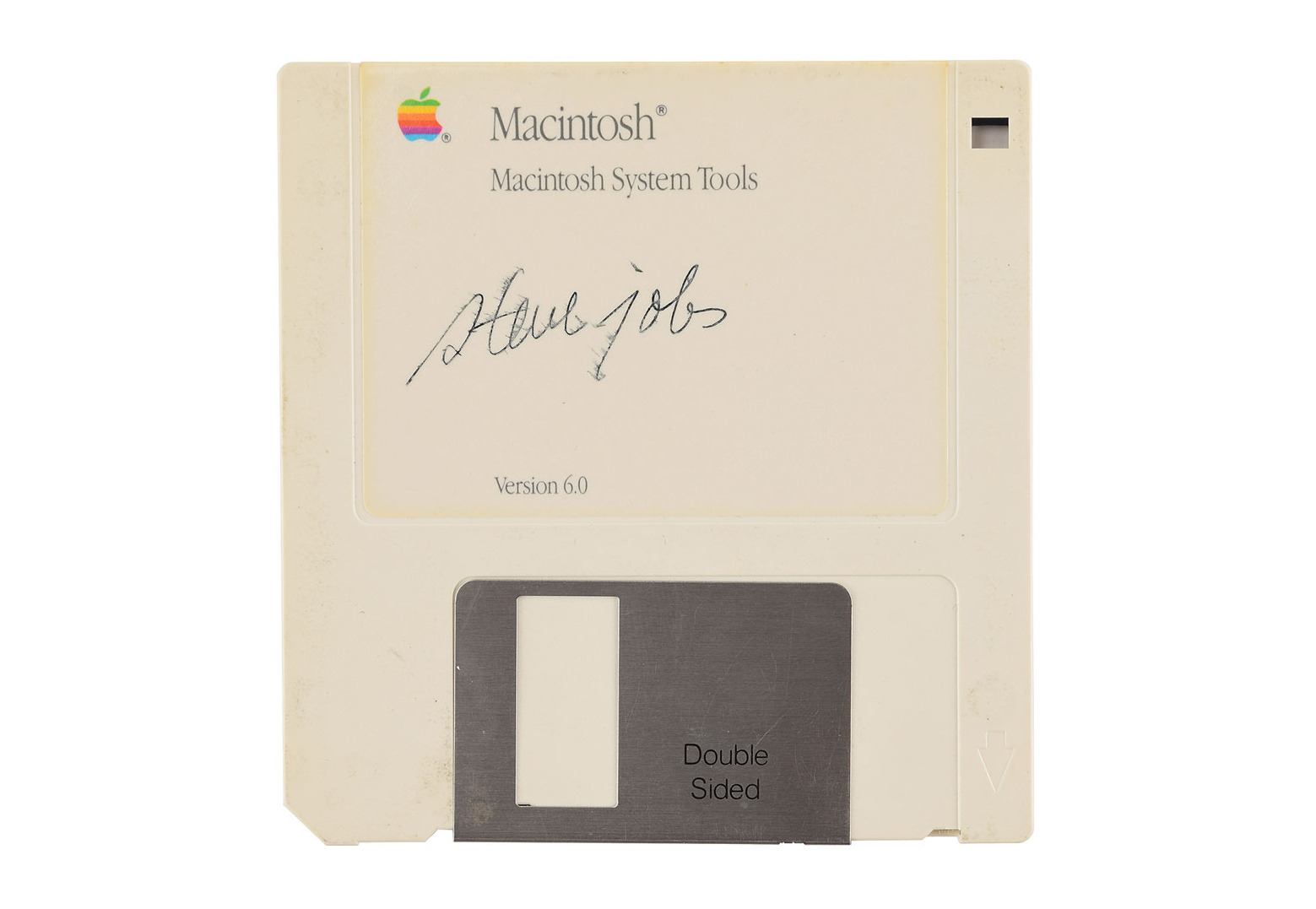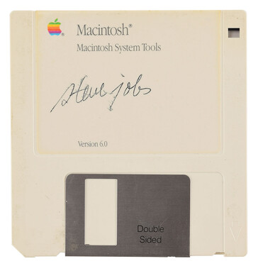 Natürlich ist nicht der Inhalt für die happigen Kosten verantwortlich – immerhin liegt der erwartete Preis nördlich von 7.500 US-Dollar – sondern die Unterschrift von Apple-Mitbegründer und Rollkragenpulliträger Steve Jobs, die mit einem schwarzen Filzstift auf die Front der Diskette geschrieben wurde, direkt unter dem damals noch bunten Apple Logo.