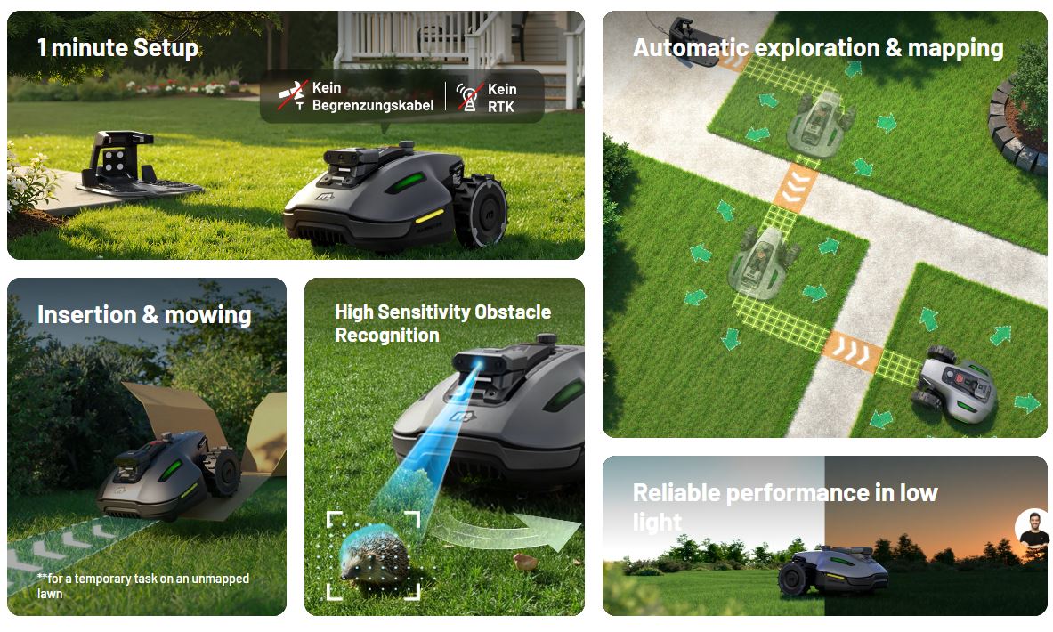 Für die Navigation werden dabei die von drei Kameras erhaltenen Daten genutzt, Herstellerangaben zufolge sollen sich damit auch Hindernisse - also Objekte oder sogar Tiere - erkennen lassen, wenn diese mindestens 5 x 5 Zentimeter groß sind. Rasenkanten sollen dann ebenso intelligent geschnitten werden. Herstellerangaben zufolge ist die Nutzung bei schwachem Licht und damit auch in der Dämmerung möglich.