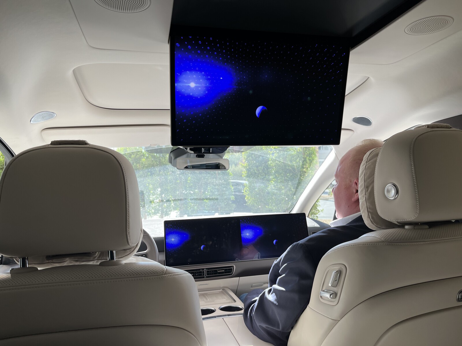 Die drei Monitore setzten alle auf OLED-Technik. Nur der hintere war allerdings durch das Dach abgeschattet. Das Fahrzeug selbst ist ein Sechssitzer gehobener Ausstattung. Laut Dolby kostet das Fahrzeug etwa 70.000 US-Dollar. Das zeigt auch, dass eine derartige Dolby-Anlage erst einmal nicht in günstigen Fahrzeugen zu erwarten ist.