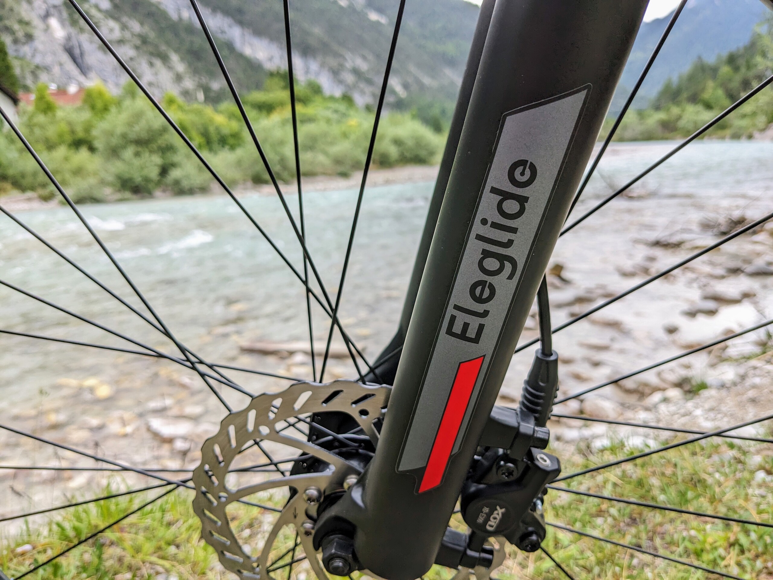 Eleglide verbaut an der Front einen LED-Scheinwerfer, der mit dem Akku des Rades verbunden ist. Am Heck gibt es hingegen keine Beleuchtung. An der Front arbeitet eine Federgabel mit 100 Millimetern Federweg. Die Gabel wird nicht mit Luftdruck unterstützt, sondern arbeitet rein mechanisch mit Federn. Die Vorspannung kann mit einem Drehrad an der Oberseite eingestellt werden. Auf dem anderen Gabelholm sitzt ein Hebel, um die Federung zu blockieren.