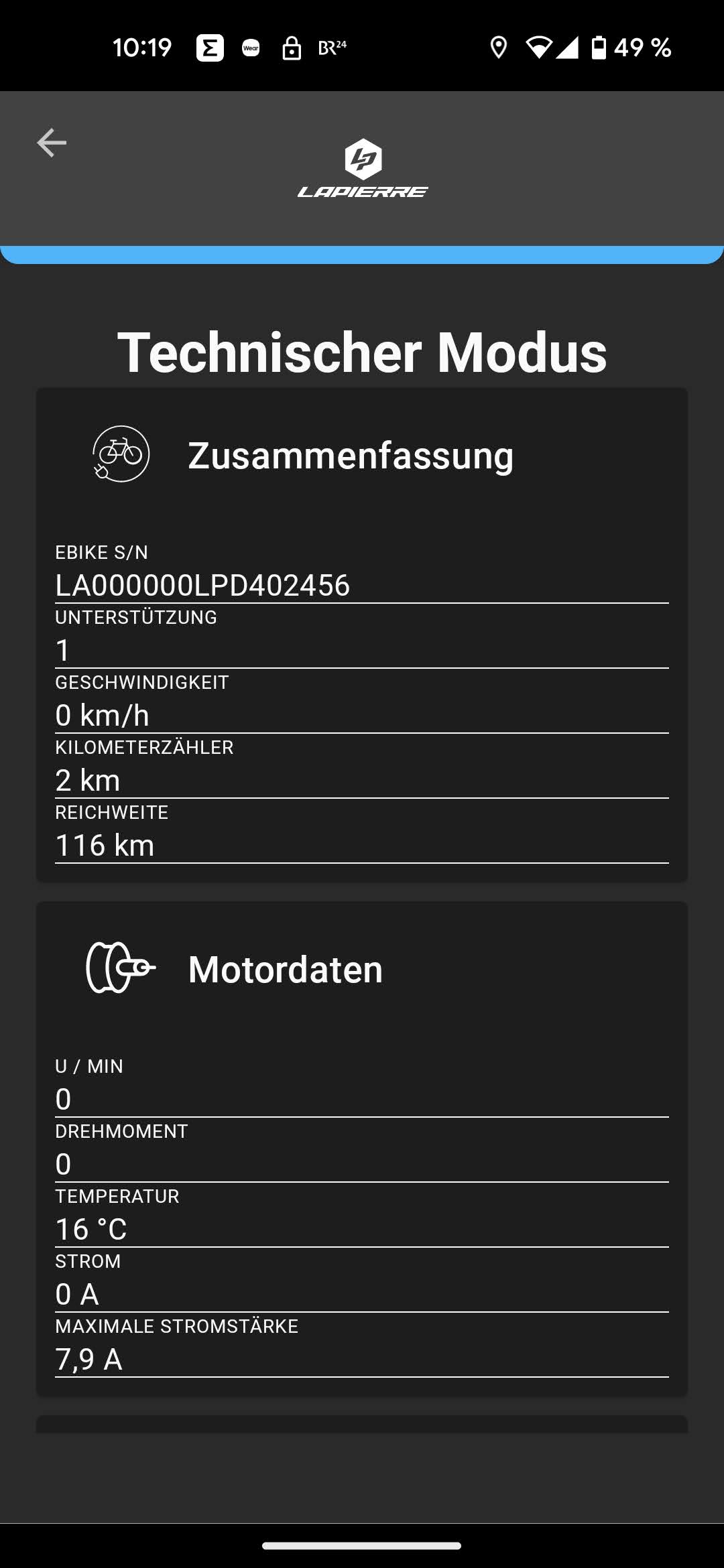 Über die App können die Daten von Motor, Akku und Bedieneinheit eingesehen werden, beim Lapierre wird auch die niedrige Laufleistung bestätigt. Außerdem zeigt die Software die Ladung des Akkus in Prozent und die errechnete Reichweite an. Auch die Nutzung der jeweiligen Leistungsmodi in absolvierten Kilometern wird angezeigt.