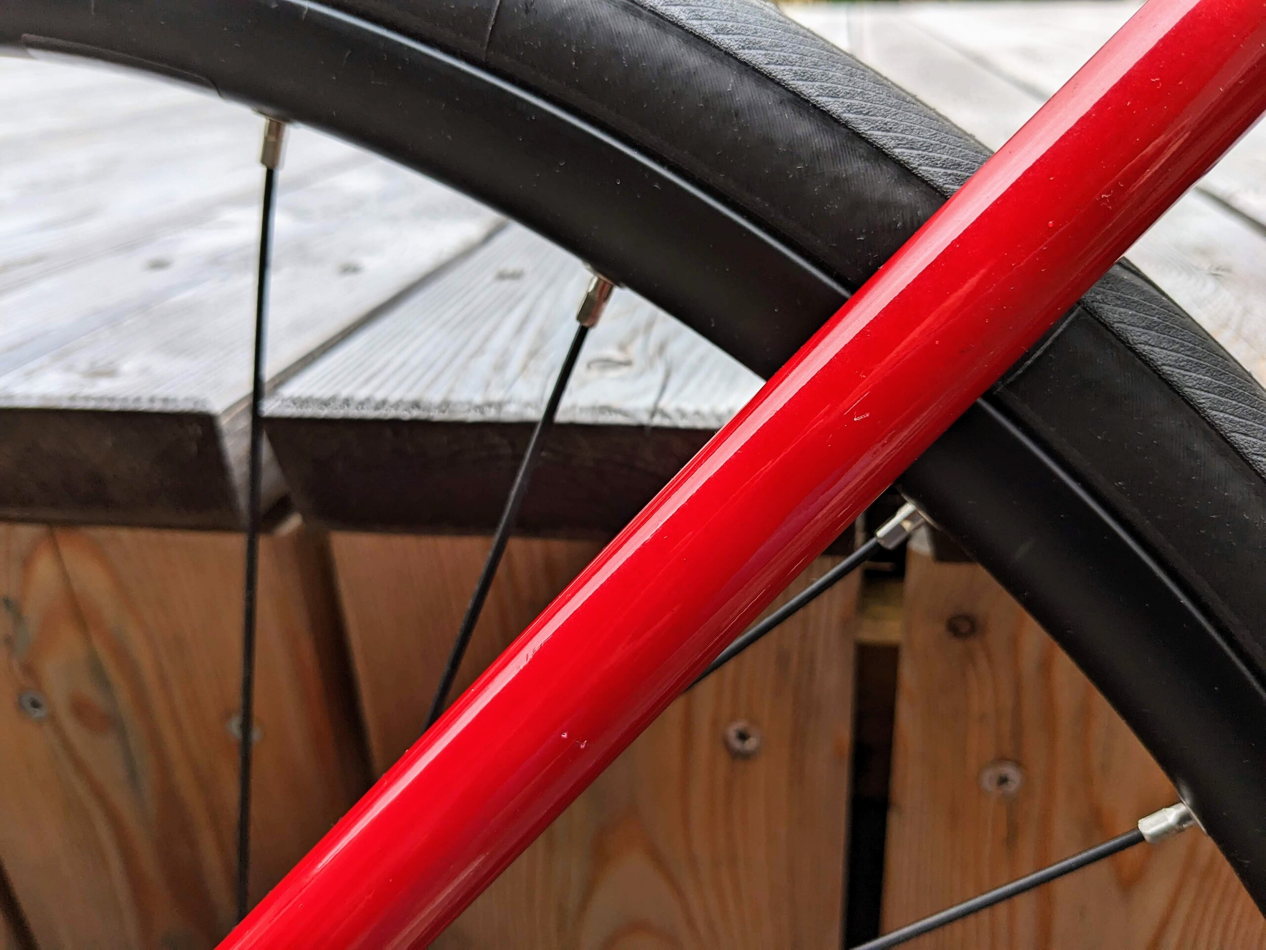 Die Gebrauchsspuren am Rad sind minimal, es gibt lediglich sehr kleine Kratzer an den Ausfallenden und an den Kurbeln. Am Oberrohr sind Kleberückstände. Davon abgesehen wirkt das Rad neu, selbst die Reifen scheinen unbenutzt. Wahrscheinlich wurde das Fahrrad als Ausstellungsstück eingesetzt. Die Historie der Räder gibt Upway allerdings leider nicht an.