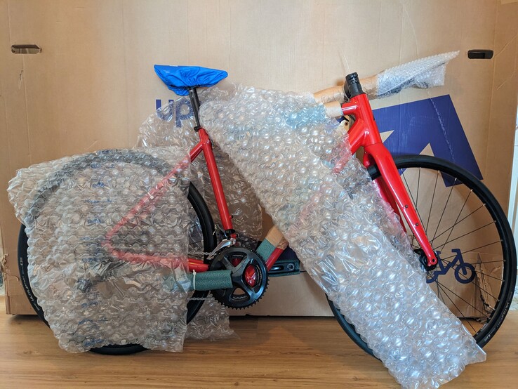 Nach mehreren Telefonaten mit DHL wird ein - selbst für Fahrradverhältnisse - sehr großer Karton geliefert, der allerdings schon ziemlich in Mitleidenschaft gezogen ist. Das Rad selbst ist aber sehr gut verpackt und hat keine Transportschäden. Das Rad ist komplett montiert, sogar die Laufräder befinden sich am richtigen Ort. Lediglich der Lenker muss um 90 Grad gedreht, die Klemmung fixiert und die Pedale montiert werden. Für diese Montageschritte liegt eine Anleitung und Werkzeug bei. Der gelieferte Inbusschlüssel hat allerdings die falsche Größe.