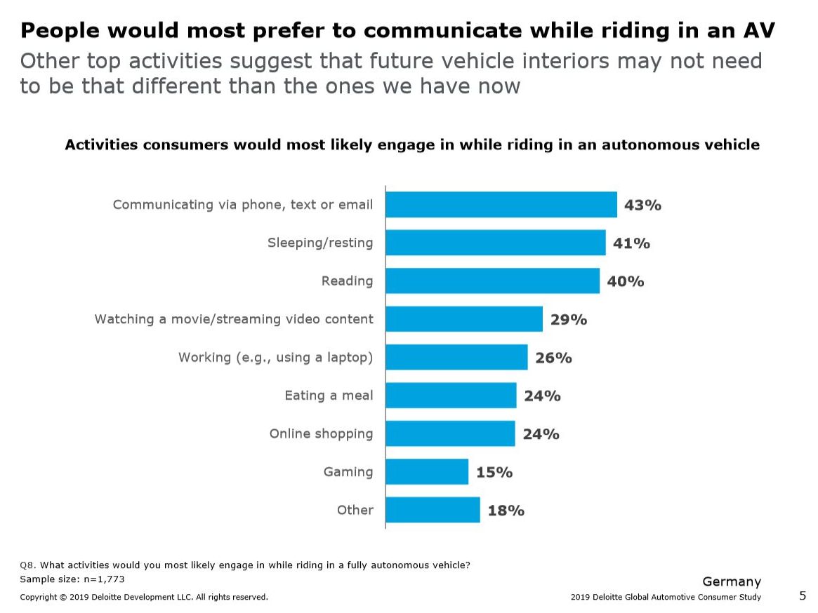 Denn gerade bei der Frage nach der Sicherheit autonomer Fahrzeuge herrscht in Deutschland offenbar große Skepsis. Das zeigt die Deloitte Global Automotive Consumer Study 2019. Die Untersuchung analysiert die Einstellung von Konsumenten in verschiedenen globalen Märkten zu den Trends im Automobilbereich. Auf dem Vormarsch ist hingegen der Elektroantrieb, auch wenn er zum Massenmarkt noch Zeit brauchen wird. Konnektivität scheint den Herstellern zunächst keine zusätzlichen Wertschöpfungspotenziale zu bringen: Die Verbraucher wollen nur einen geringen Zusatzobulus für Connectivity Services bezahlen.