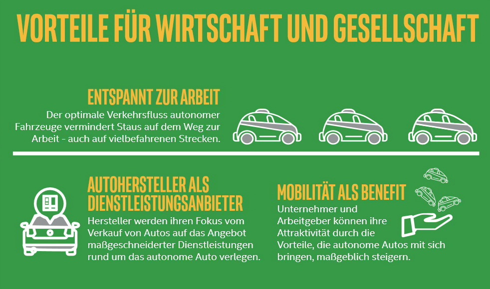 Intel hat den Begriff Passenger Economy sehr anschaulich in einer Infografik visualisiert (siehe Bilderstrecke unten). Im Kern geht es darum, wie das Auto zum Dienstleister und Mobilität selbst immer mehr zur Dienstleistung wird. In der automobilen Zukunft wird der private Besitz von Fahrzeugen in den industrialisierten Ländern und dort vor allem in den urbanen Bereichen drastisch zurückgehen, so die These. Vollautonomes Pendeln spart Zeit und verbannt Staus in die Geschichte. Dank modernsten Multimediafunktionen mit Rundum-Displays und Heads-Up-Einblendungen in den Scheiben können sich die Mitfahrer auf dem Weg zum Ziel entspannen.