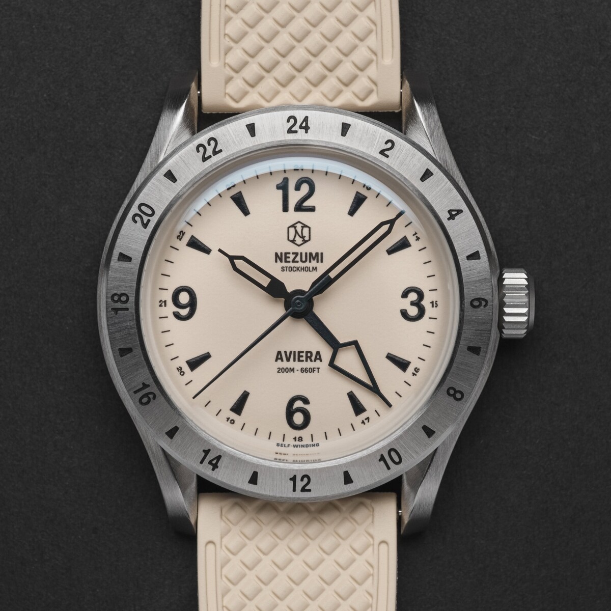 Angetrieben wird die Uhr vom automatischen Miyota-Kaliber 9075 mit GMT-Funktion, 28.800 Halbschwingungen pro Stunde und einer Gangreserve von 42 Stunden. Die Aviera GMT ist bis 200 Meter (20 bar) wasserdicht und somit auch zum Tauchen geeignet. Auf dem Zifferblatt verzichtet Nezumi bewusst auf Zusatzfunktionen wie Datum oder Hilfszifferblätter – für eine klare, fokussierte Optik.