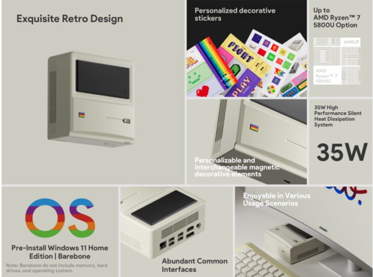 Der Ayaneo AM01 soll sich vor allem durch das charmante Retro-Design von der Konkurrenz unterscheiden, das recht offensichtlich vom ersten Macintosh aus dem Jahr 1984 inspiriert wurde. Magnetische Sticker erlauben es, den Look ein wenig zu personalisieren. Der PC unterstützt zwei 4K-Monitore über DisplayPort 1.4 und HDMI 2.0, Wi-Fi 6, Bluetooth 5.2 und bietet immerhin vier USB-A-Ports und einen USB-C-Anschluss, der allerdings nur Daten übertragen kann, und weder Strom bereitstellt, noch Monitore betreiben kann.