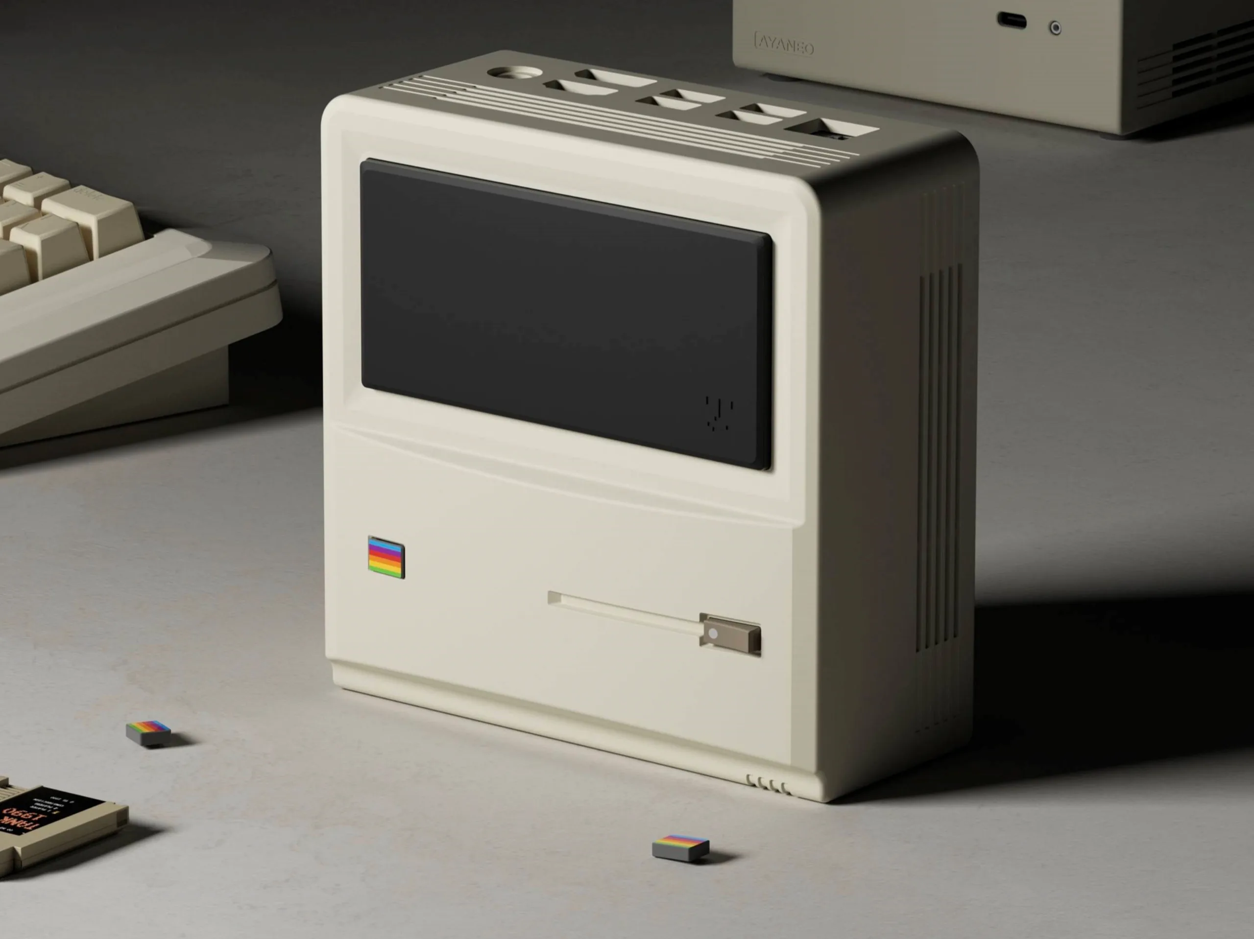 So erinnert der Ayaneo AM01 von der optischen Gestaltung ganz deutlich an einen älteren Mac, an der Vorderseite des Systems ist sogar ein Logo zu finden, welches von der Farbgebung her an das klassische Apple-Logo erinnert. Dabei sind die Anschlüsse an der Oberseite zu finden. Auch wenn Ayaneo noch keine genauen, technischen Daten bekannt gegeben hat, sind zumindest mehrere USB-Anschlüsse ebenso zu sehen wie offenbar ein Ethernet-Port und ein Rundstecker für die Versorgung mit elektrischer Energie.