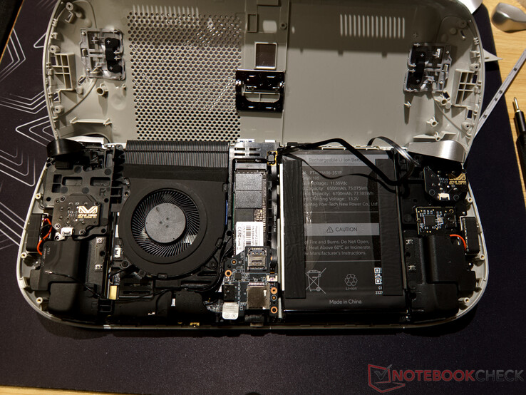Wirklich leicht fällt das Auseinanderbauen des Ayaneo Kun nicht. Hierfür muss man zunächst die beiden Griffabdeckungen an der Rückseite entfernen. Auch die Leiste zwischen den Schultertasten will entfernt werden. Dann liegen alle Schrauben, die es zu entfernen gilt, frei. Um im Inneren an sämtliche Anschlüsse zu gelangen, entfernt man weitere Schrauben und steckt einige Flachbandkabel ab. Besondere Aufmerksamkeit sollte man dabei dem Flachbandkabel zum Fingerabdrucksensor gewähren. Dieses ist zwar lang genug, um die Unterschale gefahrlos zu entfernen, könnte aber durch Knicken leicht beschädigt werden. Um an die M.2-2280-NVMe-SSD zu gelangen, muss zunächst das Anschluss-Board für den microSD-Kartenleser und die SIM-Karte entfernt werden. Auf einer der Schrauben befindet sich, wie beim Air 1S, ein Garantiesticker, der sich jedoch leicht vollständig entfernen lässt. Auch das WLAN-Modul ist tauschbar, befindet sich jedoch noch tiefer verbaut. So müssen auch der Lüfter und ein Kunststoffrahmen ausgebaut werden, um zur Steckkarte Zugriff zu haben. Der Anschluss für das LTE-Modem ist in unserem Fall nicht belegt, könnte jedoch nachgerüstet werden. Allerdings sehen wir in unserem Testgerät keine entsprechenden Antennen vormontiert. Für ältere Handhelds bietet Ayaneo viele Ersatzteile im hauseigenen Shop an. Sicher werden dort bald Teile für das Ayaneo Kun folgen.