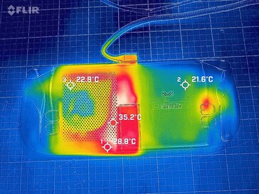Bei Gaming-Handhelds ist die Temperatur der Geräte auf der Langstrecke mitentscheidend dafür, ob das Gerät überhaupt zum Zocken taugt. Unsere Wärmebilder sowie auch unsere praktischen Erfahrungen zeigen, dass das Kun zumindest an den Stellen, wo es drauf ankommt, angenehm kühl bleibt. Die beiden Controller und alle Tasten erwärmen sich wenn dann nur knapp über die Raumtemperatur. Deutlich wärmer werden da der Bildschirm und die Rückseite über dem Mainboard. Punktuell zeigte unsere Wärmebildkamera auf der Rückseite 90 °C an, aber hier muss man gleich sagen, dass die direkten Oberflächenmessungen des Kunststoffgehäuses und des Bildschirms eher um 60 °C liegen. Wir vermuten, dass der Metallic-Lack die Wärmebildkamera irritiert. Das K-Type-Thermoelement und das Fluke t3000 zeigen so wohl eher sinnvolle Werte an. Dies bestätigt auch das subjektive Temperaturempfinden.