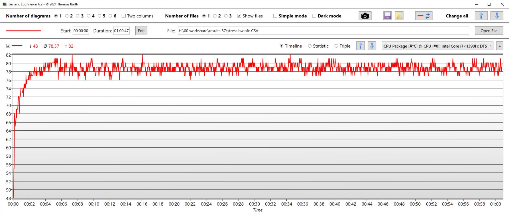 Im Stresstest laufen Prime95 und Furmark gleichzeitig. Die CPU taktet kurz auf über 2,8 GHz hoch, nach einem kurzen Einbruch kann der Prozessor für die folgenden fünf Minuten einen Takt von 2,8 GHz halten, danach bricht dieser zyklisch immer wieder auf 1,8 bis 2,3 GHz ein. Dabei steigen die einzelnen Kerntemperaturen nie höher als bis auf 78°C. Die CPU als Gesamtpaket erhitzt sich allerdings auf bis zu 82 °C, im Schnitt werden hier 78 °C eingehalten.