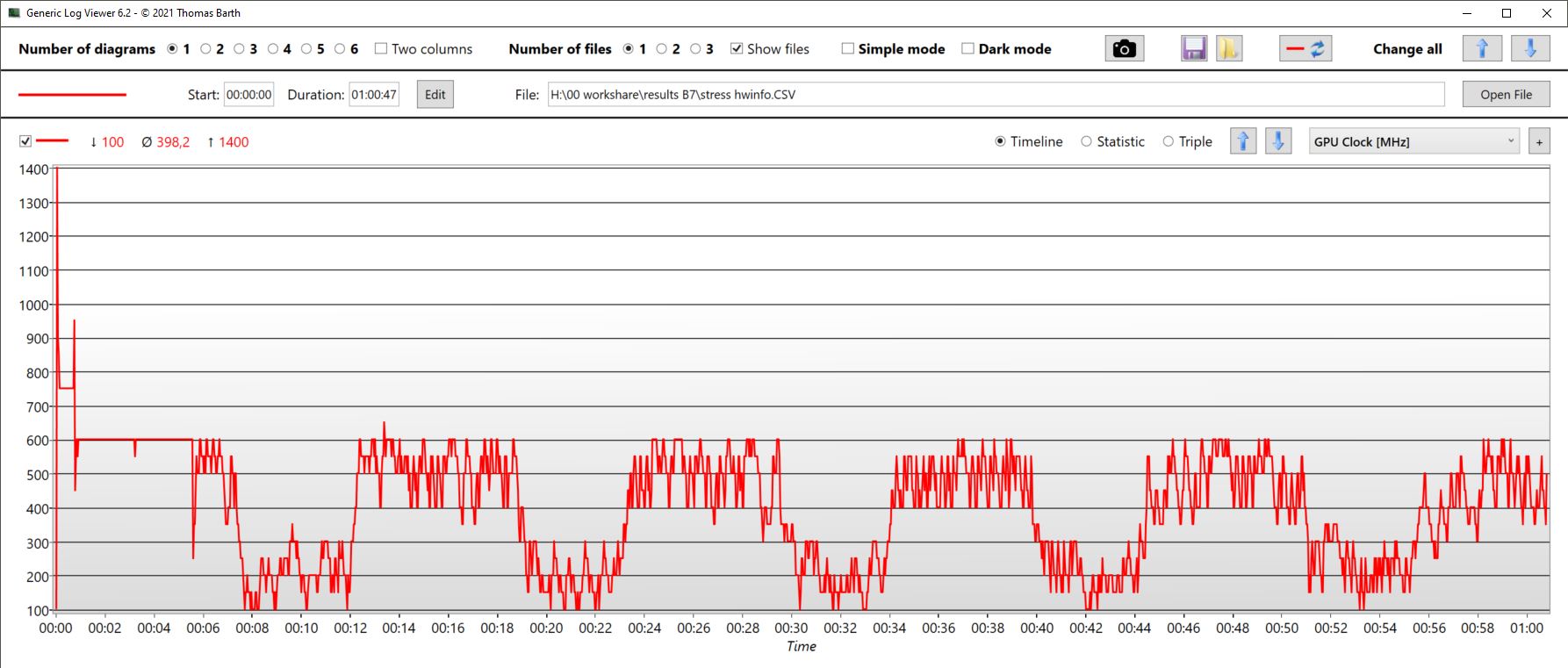 Die integrierte GPU taktet ganz kurz mit 1,4 GHz, danach findet hier das gleiche, periodische Absinken des Taktes von etwa 600 MHz auf 100 bis 350 MHz statt. Im Schnitt taktet die Grafikeinheit mit 400 MHz.