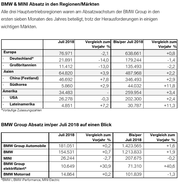 Für den weltweiten Absatz von Elektrofahrzeugen in den ersten sieben Monaten dieses Jahres meldet BMW 71.310 Fahrzeuge. Das entspreche einer Steigerung um 40,6 Prozent gegenüber dem vergangenen Jahr 2017. Der Juli-Absatz von BMW i, BMW i Performance und Mini Electric Fahrzeugen betrug 10.649 Einheiten (+30,9 Prozent).